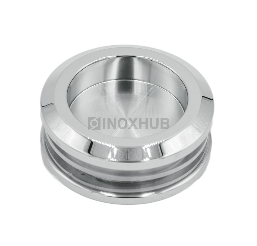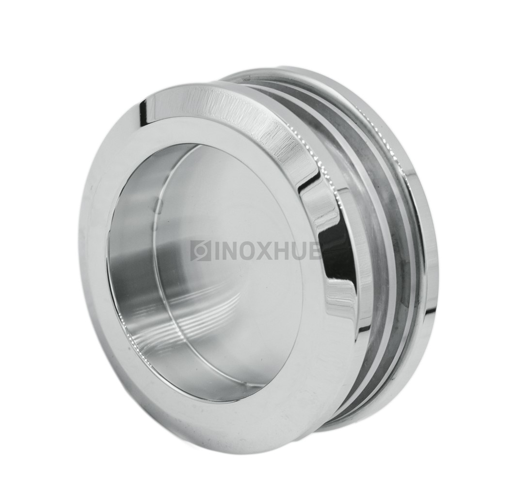 Ручка для раздвижной двери изготовлена из нержавеющей стали AISI 304. Стальной сплав не покрывается ржавчиной, не окисляется в условиях постоянного воздействия влаги, горячего пара, перепадов температур. Форма в виде шайбы с отверстием для пальцев не имеет сильно выпирающих элементов, не уменьшает амплитуду движения откатной двери. Полированная поверхность не теряет свой блеск при правильной эксплуатации фурнитуры, гармонично сочетается с другими элементами интерьера ванной комнаты.