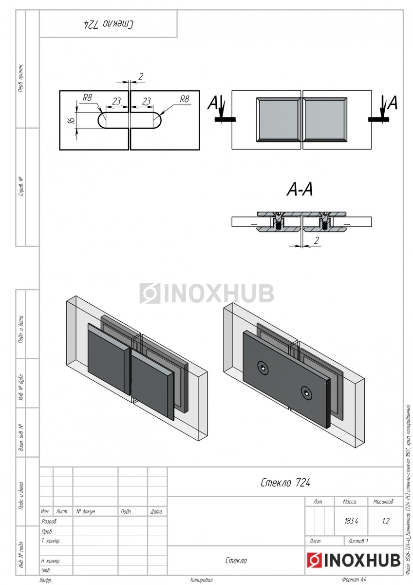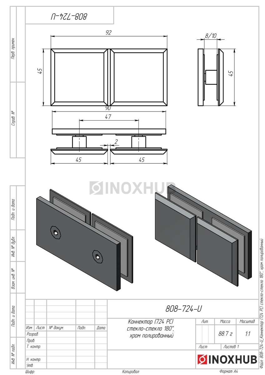 Коннектор (724 PC) стекло-стекло 180°, полированный хром, в соответствии отраслевым стандартам из коррозионно-стойкого материала. Изделие применяется в составе металлических, стеклянных или комбинированных конструкций, где важны точные размеры, прочность соединений и стабильность в эксплуатации. Может использоваться при внутреннем и наружном монтаже — в зависимости от поставленной задачи и совместимых компонентов.