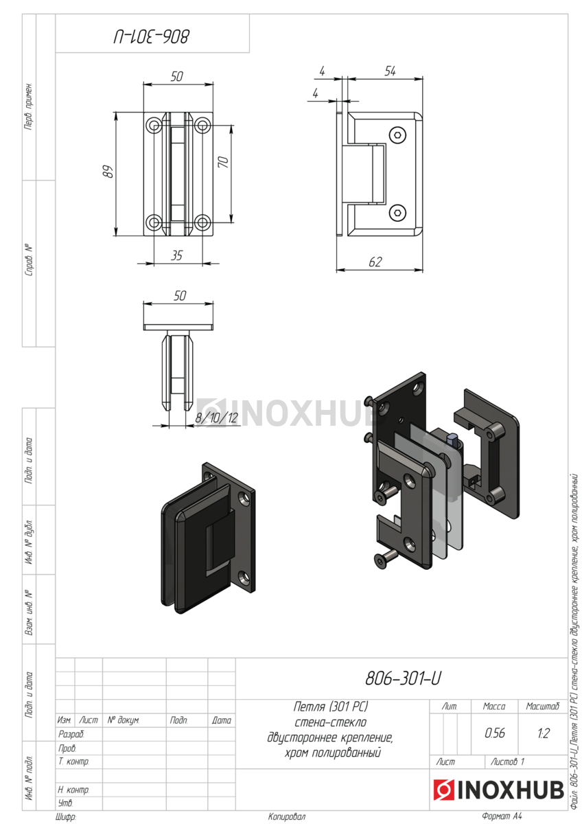 Петля стена-стекло двустороннее крепление, 301 PС, для стекла 8-12 мм, прекрасно подходит для изготовления индивидуальных душевых кабин, также подходит для влажных помещений, обладает высокими эстетическими свойствами, благодаря качественному гальваническому покрытию.