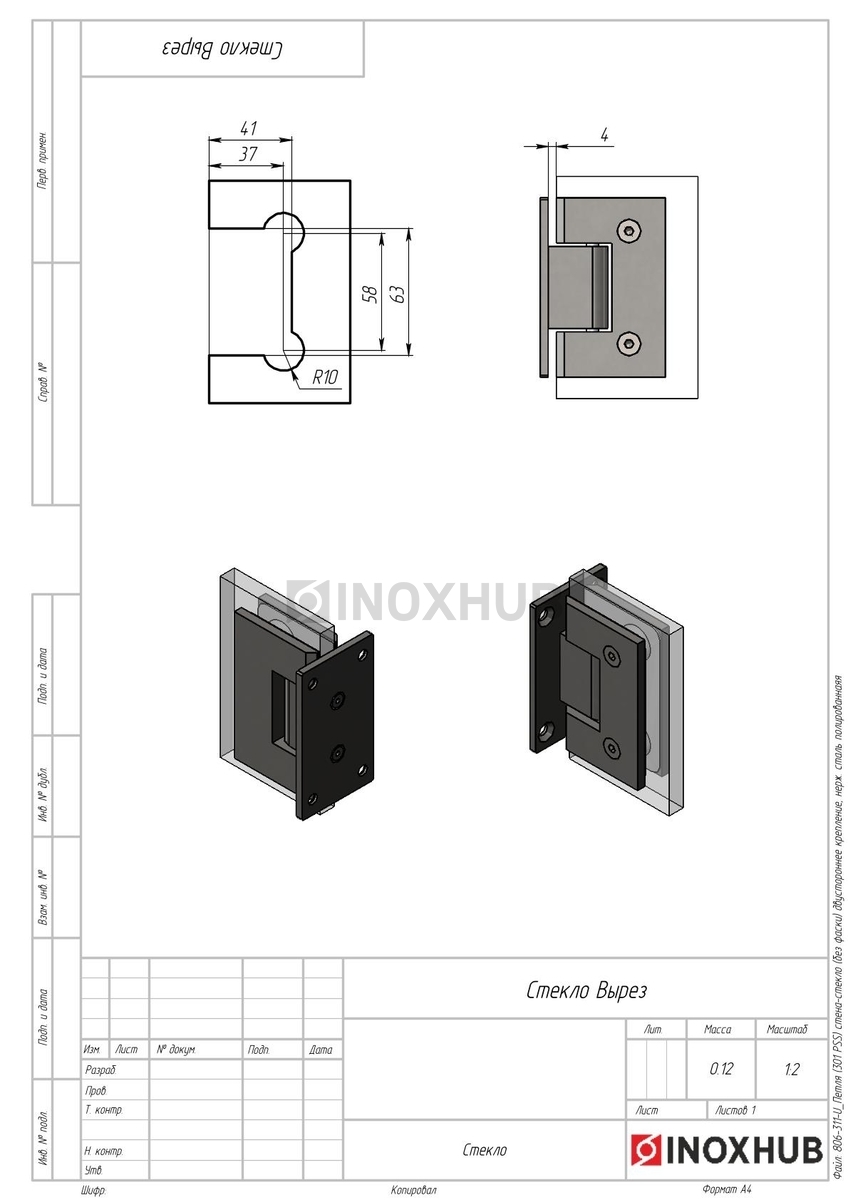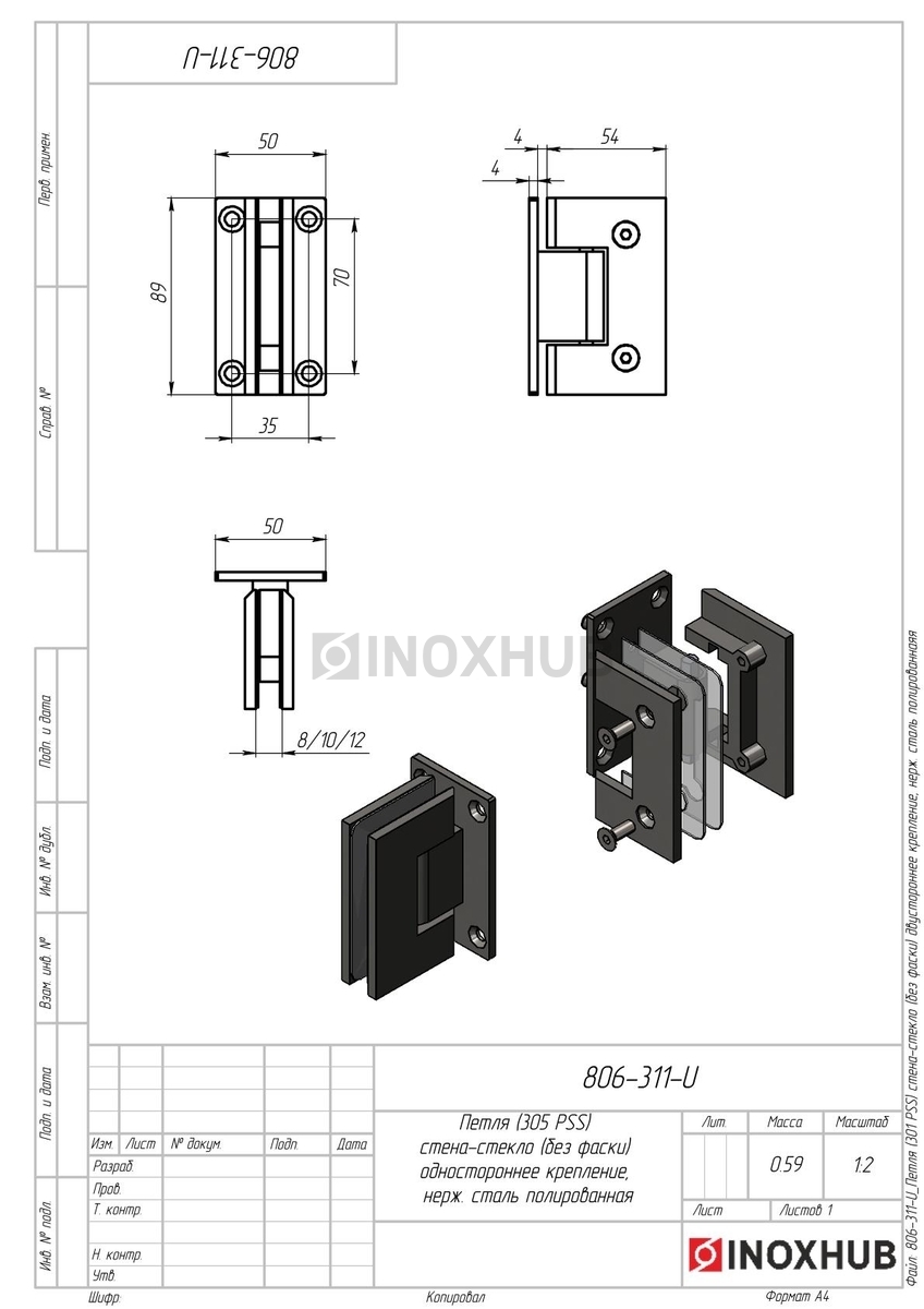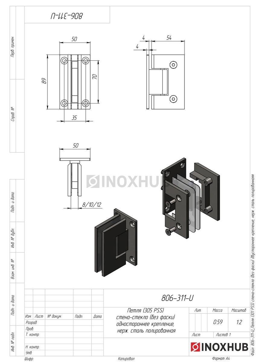 Сборка и монтаж. Перед установкой необходимо подготовить стекло и собрать петлю согласно чертежам и схемам. В комплекте поставляются прокладки для прочной фиксации стеклопанели. Стекло зажимается между пластинами петли, которые соединяются двумя шестигранными болтами. Установочная площадка крепится на 4 болта к стене с двух сторон, поэтому нагрузка распределяется равномерно, петли не выгибаются.