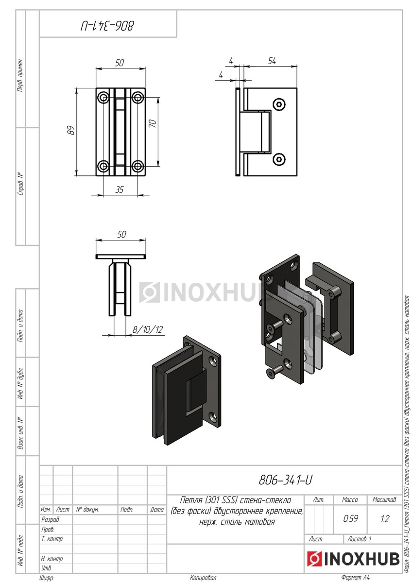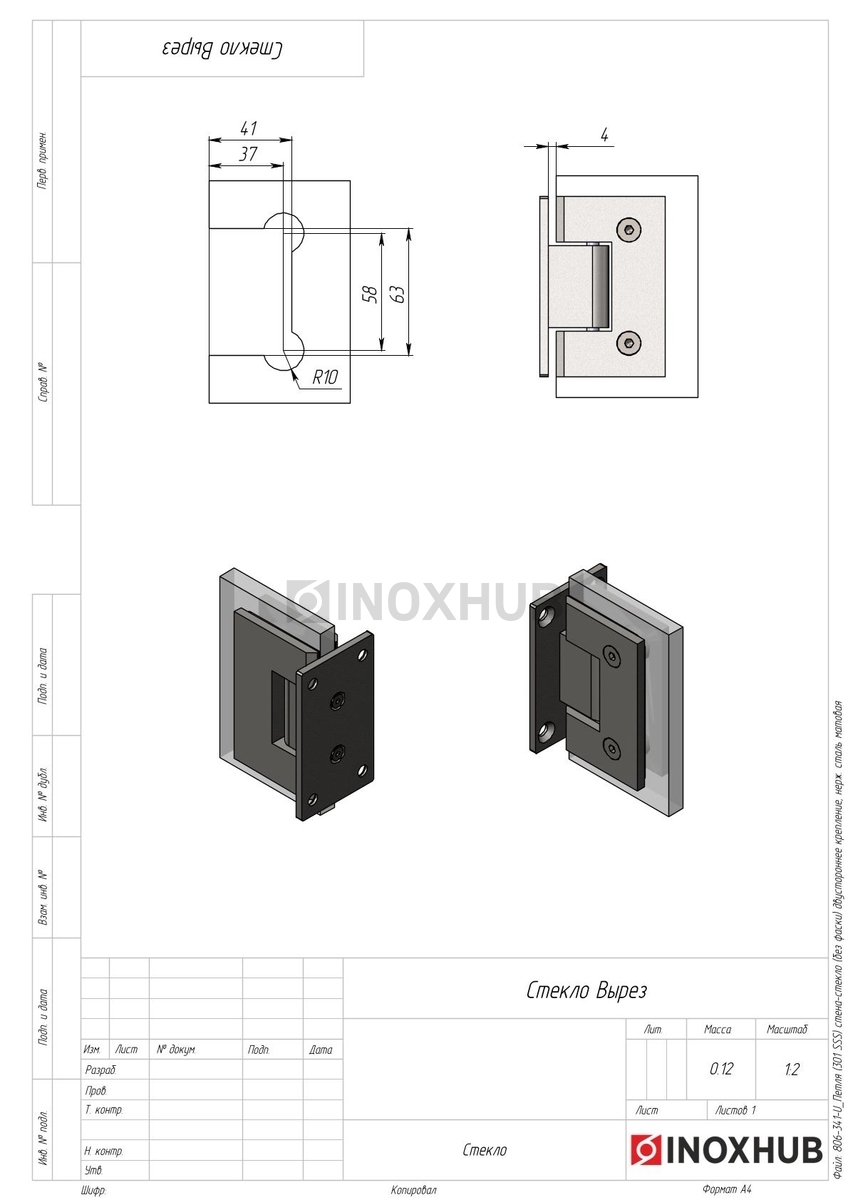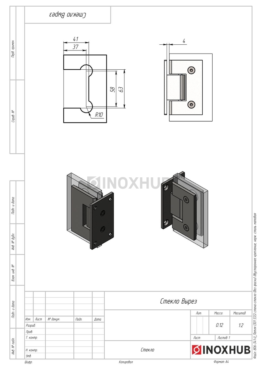 Сборка и монтаж. Перед установкой необходимо подготовить стекло и собрать петлю согласно чертежам и схемам. В комплекте поставляются прокладки для прочной фиксации стеклопанели. Стекло зажимается между пластинами петли, которые соединяются двумя шестигранными болтами. Установочная площадка крепится на 4 болта к стене с двух сторон, поэтому нагрузка распределяется равномерно, петли не выгибаются.