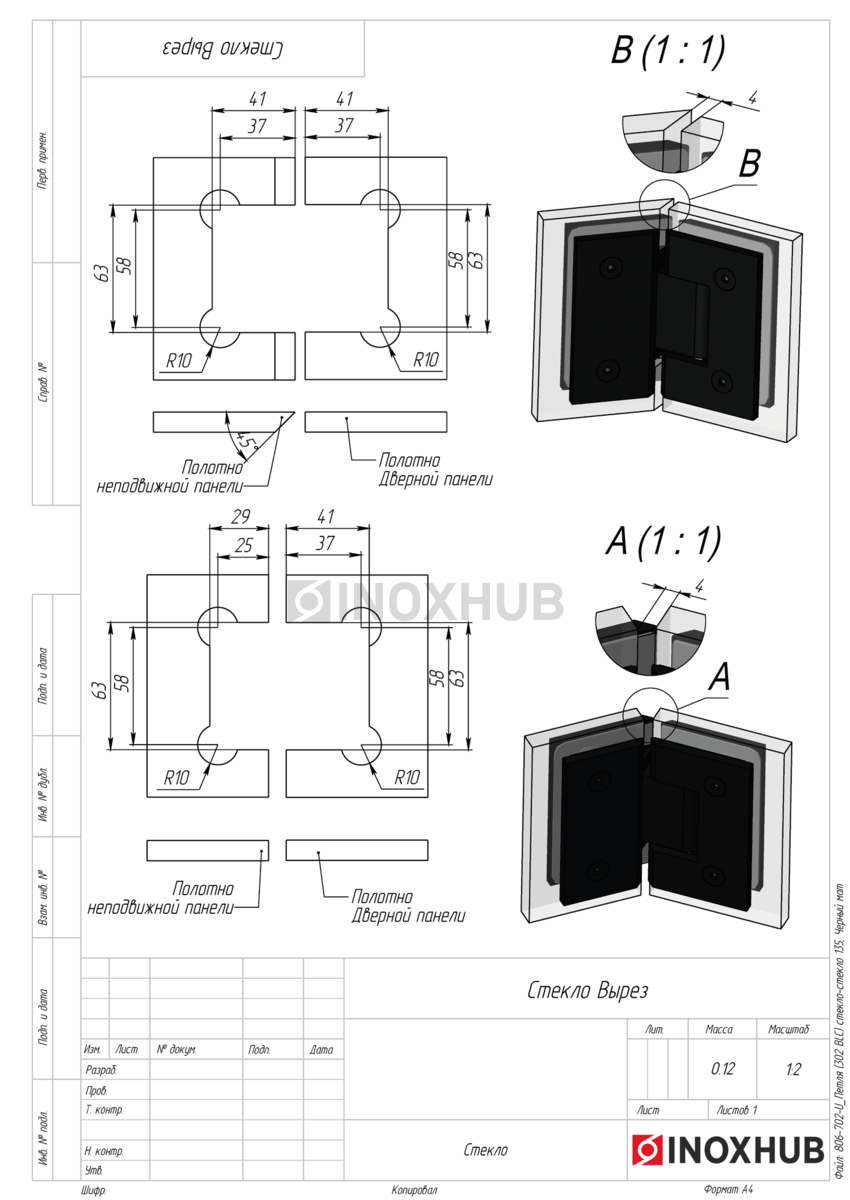Сборка и монтаж. Перед установкой необходимо подготовить стекло и собрать петлю согласно чертежам и схемам. В комплекте поставляются прокладки для прочной фиксации стеклопанели. Стекло зажимается между пластинами петли, которые соединяются двумя шестигранными болтами с каждой стороны. В конструкции заложена система скрытого крепежа.
