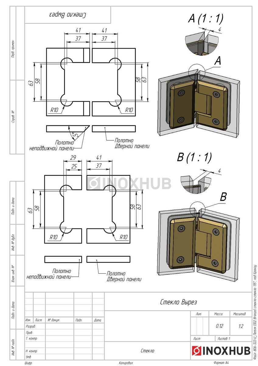 Сборка и монтаж. Перед установкой необходимо подготовить стекло и собрать петлю согласно чертежам и схемам. В комплекте поставляются уплотнители для прочной фиксации стеклянной панели. Стекло зажимается между пластинами петли, которые соединяются двумя шестигранными болтами с каждой стороны. В конструкции заложена система скрытого крепежа.