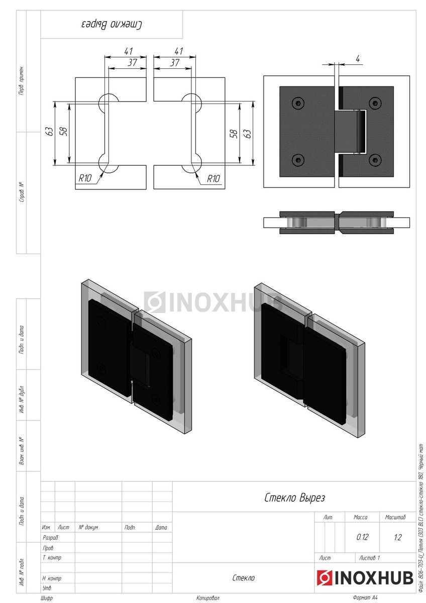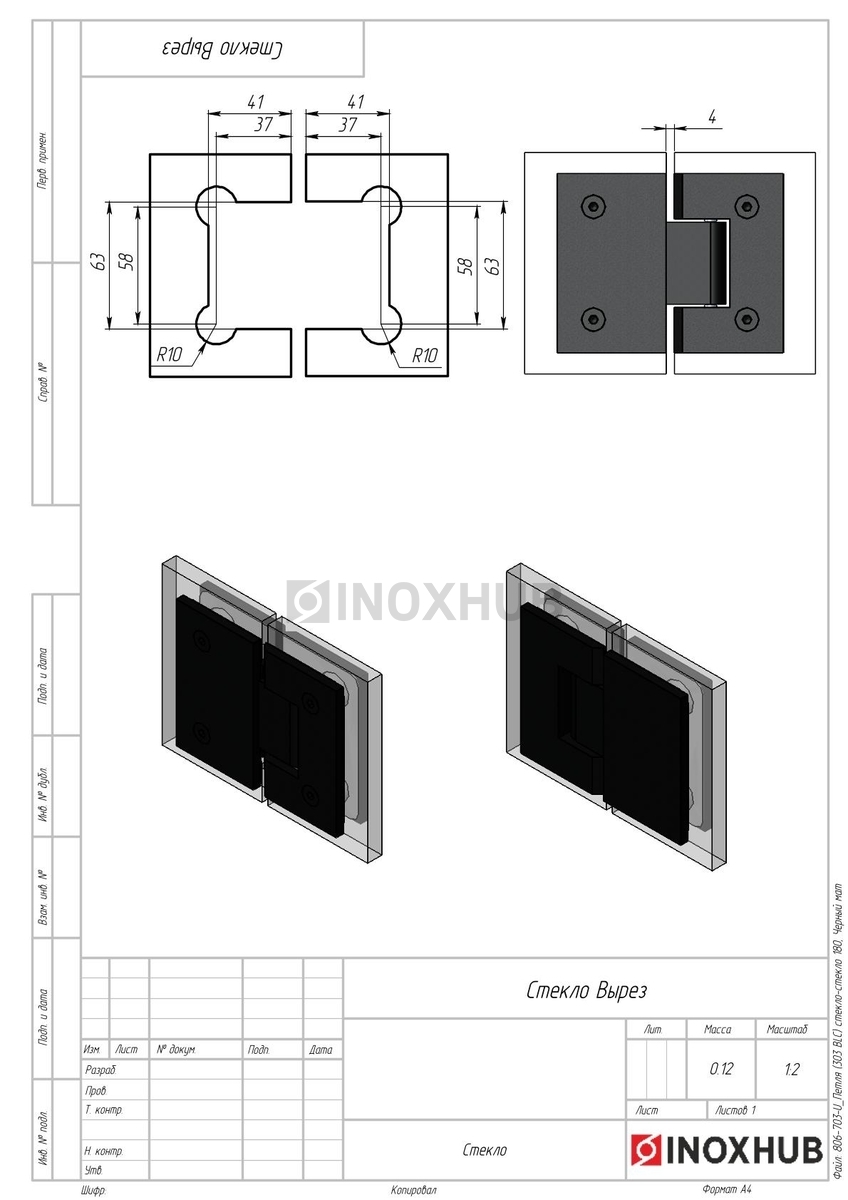 Сборка и монтаж. Перед установкой необходимо подготовить стекло и собрать петлю согласно чертежам и схемам. В комплекте поставляются прокладки для прочной фиксации стеклопанели. Стекло зажимается между пластинами петли, которые соединяются двумя шестигранными болтами с каждой стороны. В конструкции заложена система скрытого крепежа.