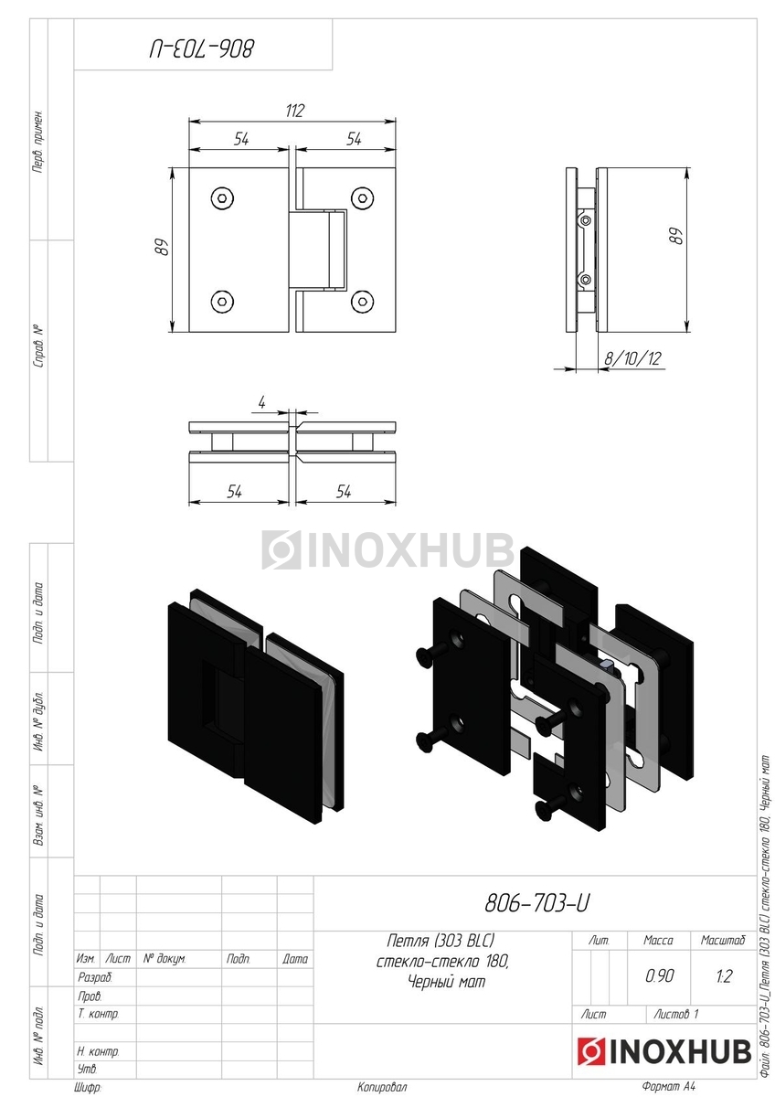 Применение. Петля используется для фиксации распашной двери душевой кабины к неподвижному стеклу в одной плоскости. Подходит в качестве крепления перегородок или ограждений из закаленного стекла в помещениях с высокой влажностью. Петля рассчитана на толщину модуля 8-12 мм и вес до 45 кг на обе петли. Обеспечивает поворот двери в обе стороны с фиксацией на 90º. Механизм самозакрывания срабатывает при открытии двери на 25º.