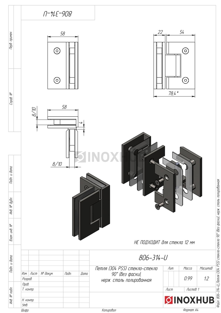 Петля (304 PSS) стекло-стекло 90° (без фаски), нерж. сталь полированная в продаже. Оперативная доставка со склада в Москве. Все товары соответствуют стандартам качества.