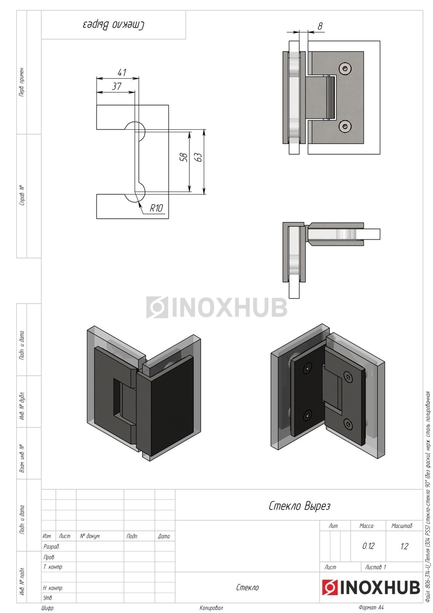 Сборка и монтаж. Перед установкой необходимо подготовить стекло и собрать петлю согласно чертежам и схемам. В комплекте поставляются прокладки для прочной фиксации стеклопанели. Стекла зажимаются между пластинами петли, которые соединяются двумя шестигранными болтами с каждой стороны. В конструкции заложена система скрытого крепежа.