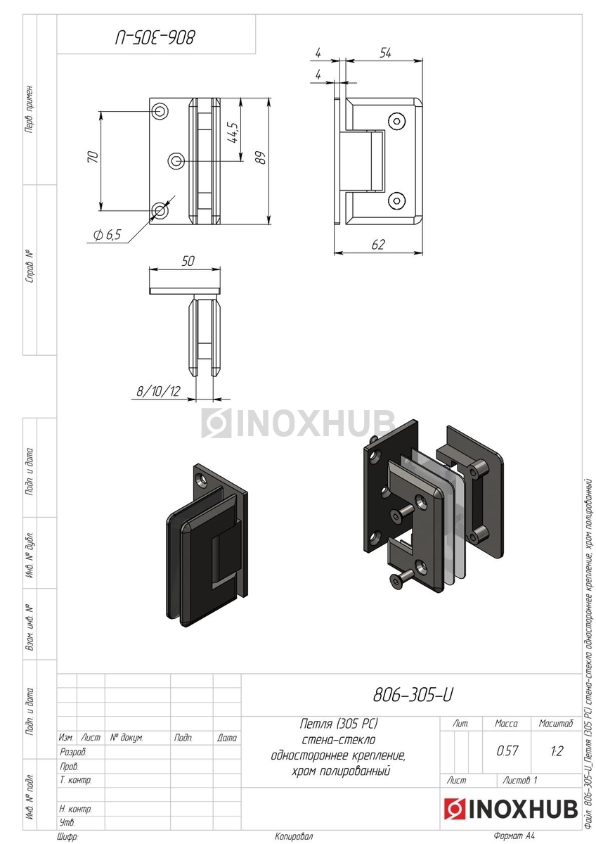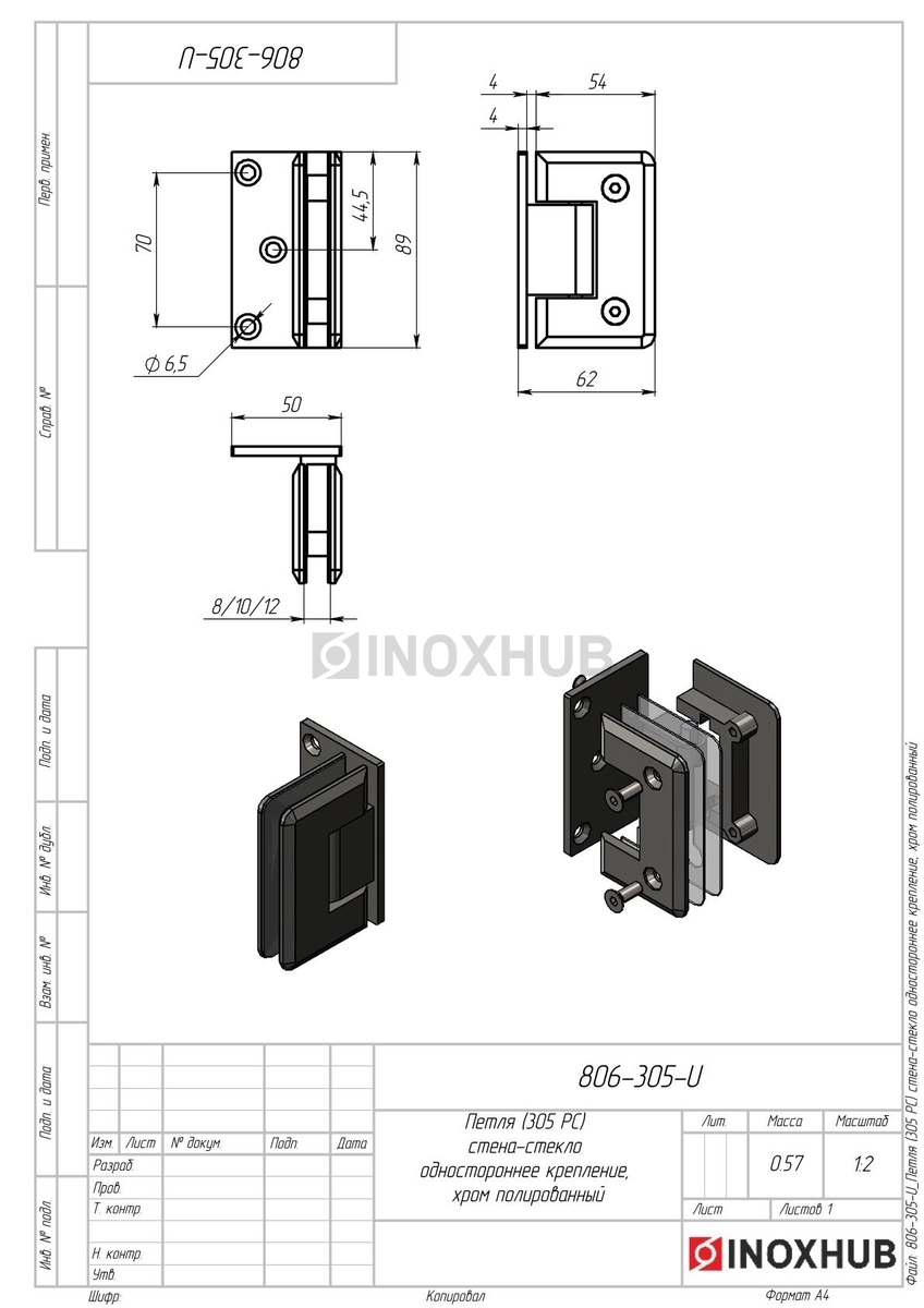 Петля стена-стекло одностороннее крепление, 305 PC, для стекла 8-12 мм прекрасно подходит для изготовления индивидуальных душевых кабин, также подходит для влажных помещений, обладает высокими эстетическими свойствами, благодаря качественному гальваническому покрытию.