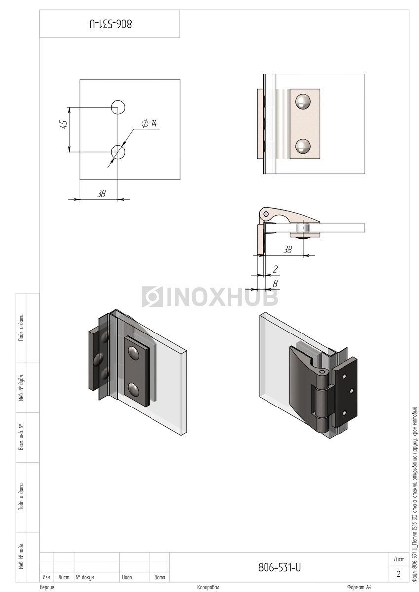 Сборка и монтаж. Подготовьте отверстия в стене и двери согласно чертежу. Петля не требует реза уплотнителя, все крепежные элементы поставляются в комплекте. Модель устанавливается на шестигранные винты.