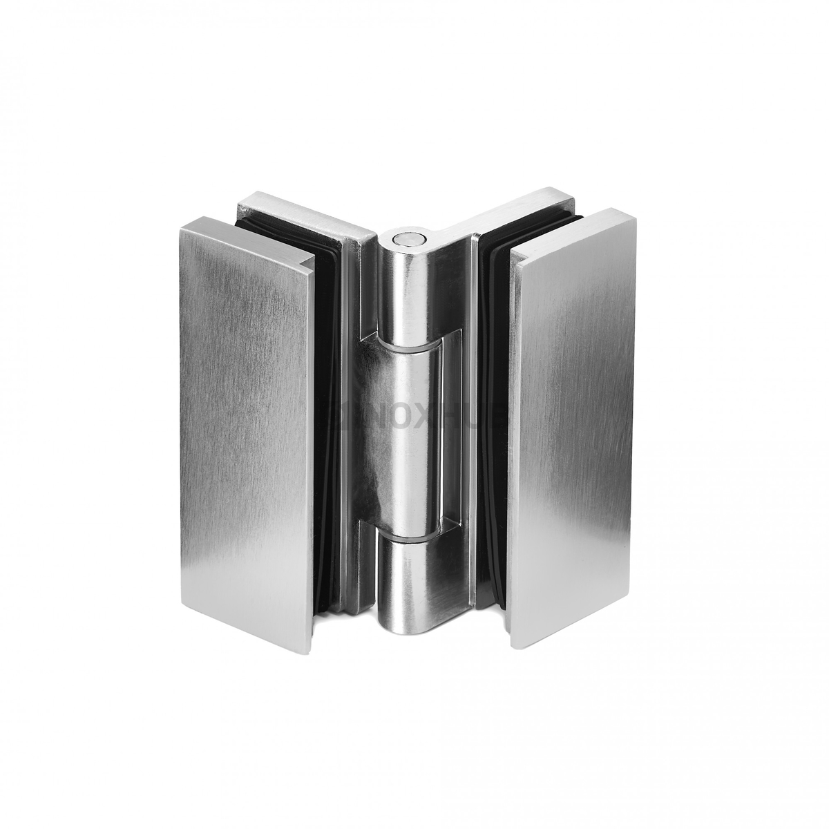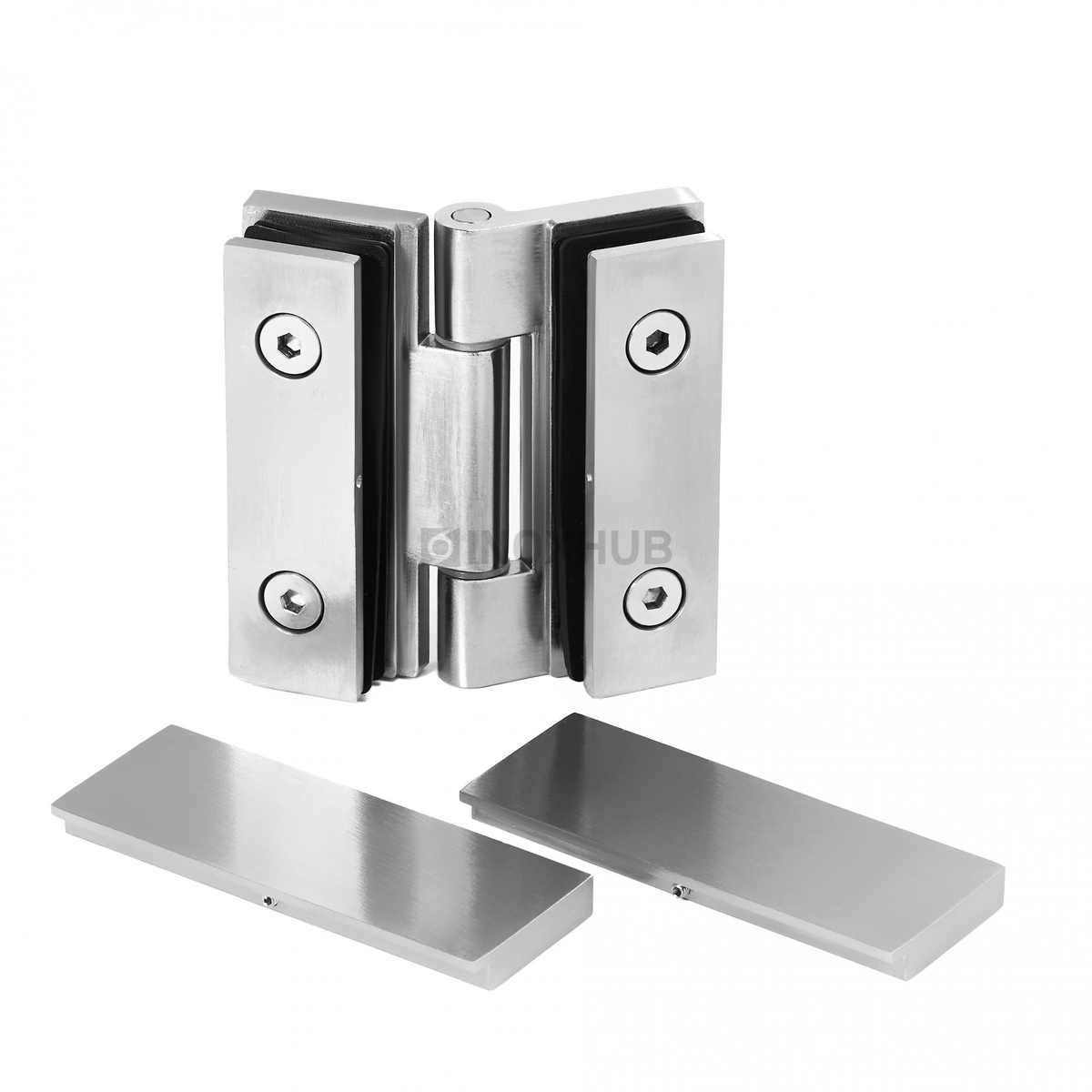 Применение. Модель используется для монтажа стеклянной двери к стационарному стеклу в одной плоскости. Толщина стеклопанели — 8-10 мм, рекомендуемый вес дверного полотна на обе петли — до 30 кг, ширина двери — до 600 мм. Модель подходит для стандартных душевых кабин, а также дверных систем типа «гармошка». Петля обеспечивает открытие двери в одну сторону на 180°. Декоративные крышки прикрывают винты, придавая механизму более эстетичный и завершенный вид.