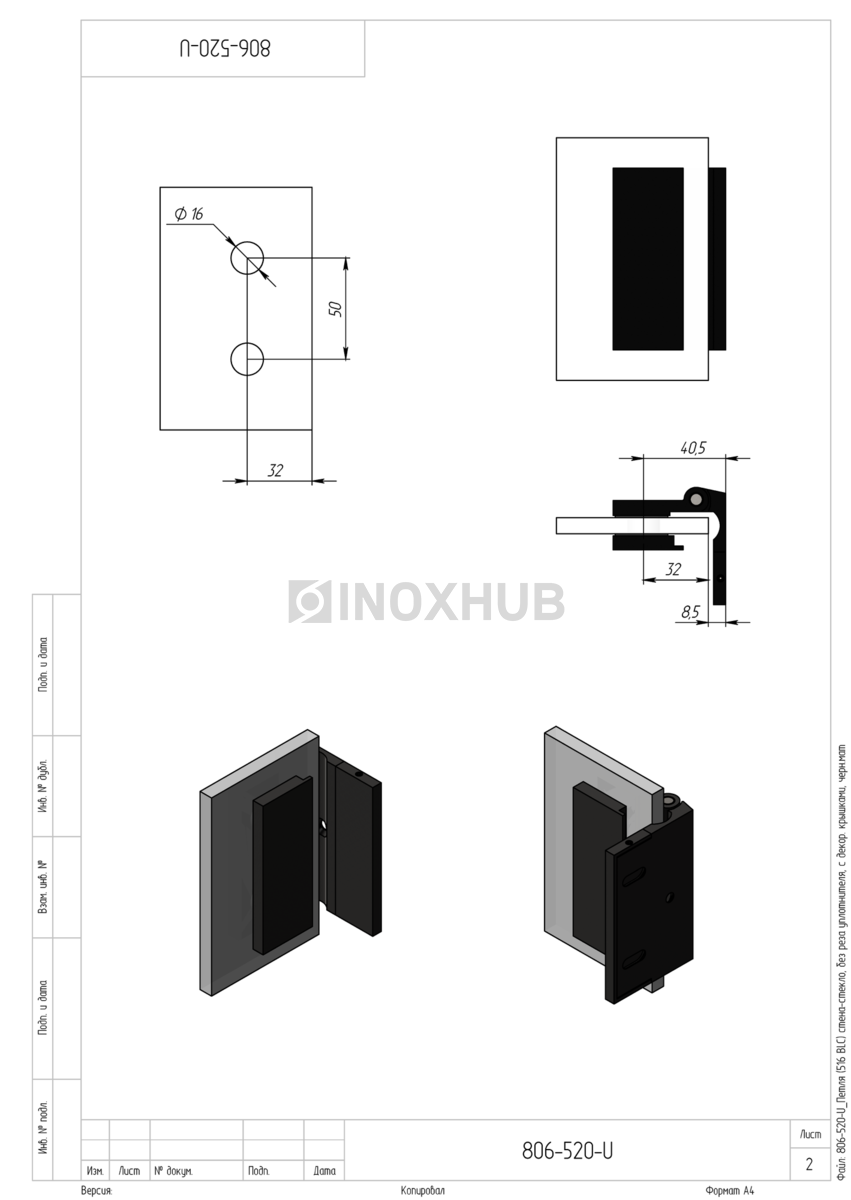 Применение. Модель используется для монтажа стеклянной двери к стене под углом 90°. Толщина стеклопанели — 8-10 мм, рекомендуемый вес дверного полотна на обе петли — до 30 кг, ширина двери — до 600 мм. Модель подходит для стандартных душевых кабин, а также дверных систем типа «гармошка». Петля обеспечивает открытие двери в одну сторону. Декоративные крышки прикрывают винты, придавая механизму более эстетичный и завершенный вид.