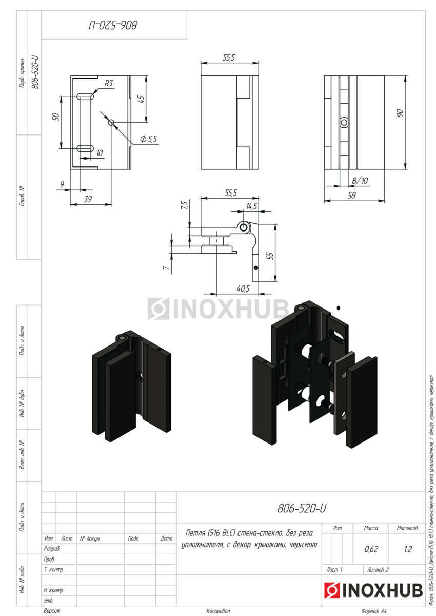 Сборка и монтаж. Подготовьте отверстия в стене и двери согласно чертежу. Петля не требует реза уплотнителя, все крепежные элементы и втулки поставляются в комплекте. Модель устанавливается на шестигранные винты. Декоративные крышки скрывают крепежные элементы.