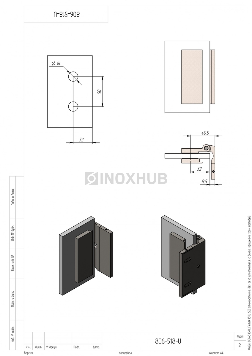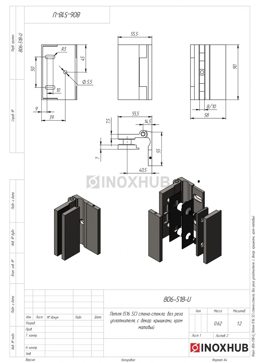 Сборка и монтаж. Подготовьте отверстия в стене и двери согласно чертежу. Петля не требует реза уплотнителя, все крепежные элементы и втулки поставляются в комплекте. Модель устанавливается на шестигранные винты. Декоративные крышки скрывают крепежные элементы.