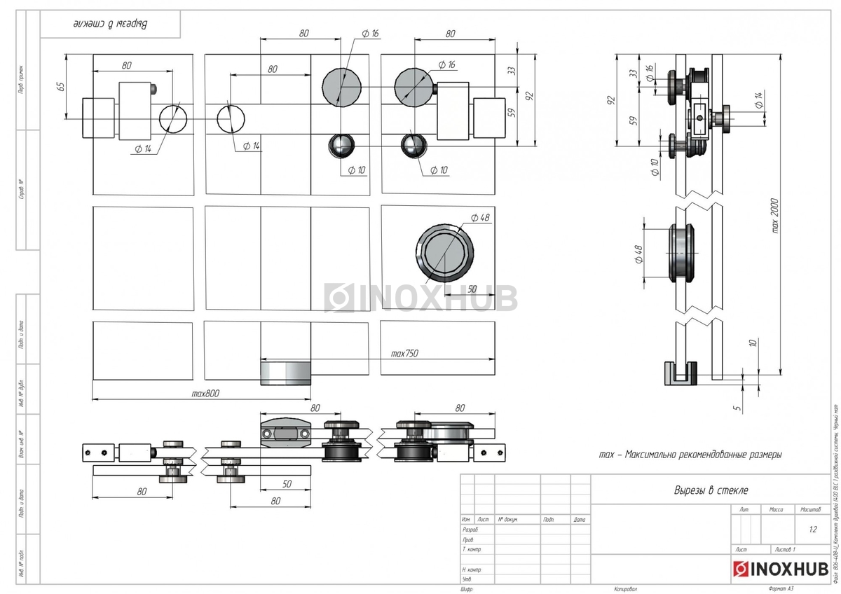Максимальные размеры створки при консольном закреплении трека – 500х2000 мм.