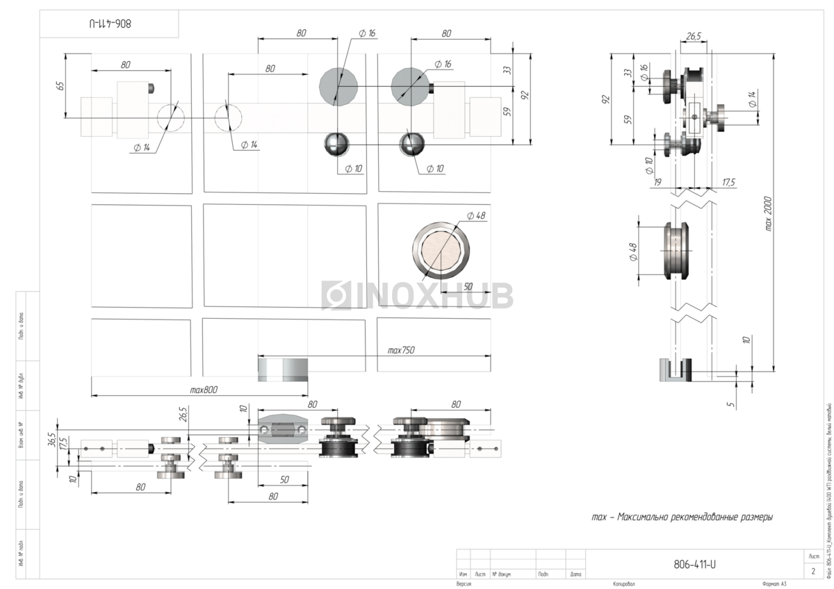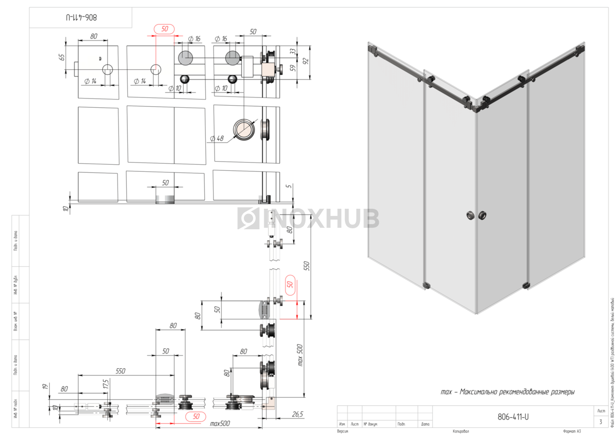 Применение. Комплект предназначен для установки раздвижных систем душевой кабины. Максимальная нагрузка на обе каретки — не более 45 кг. Максимально допустимый размер одной створки при консольном закреплении трека — 500х2000 мм. Комплект обеспечивает плавное, практически бесшумное открывание и закрывание дверей.