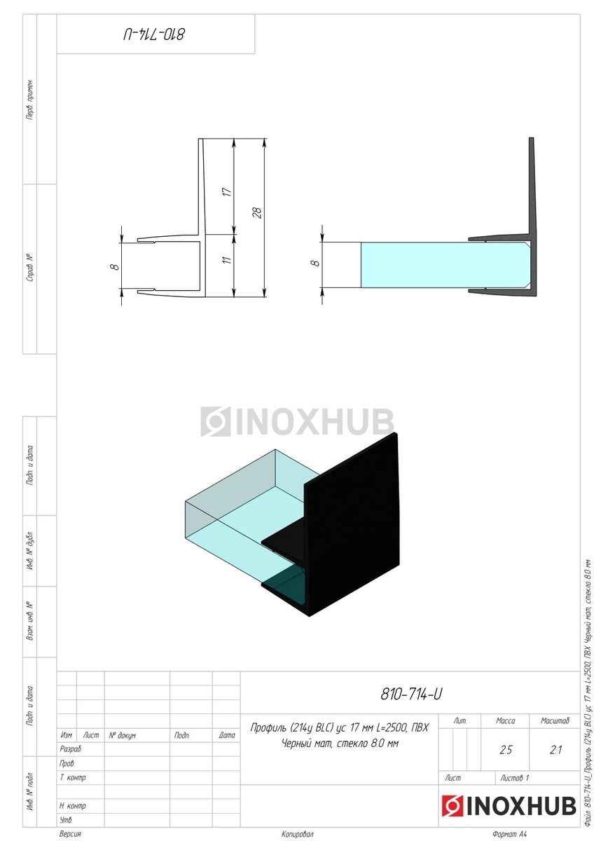 Профиль (214-8 BLC) ус 17 мм, L=2500, стекло 8.0 мм, ПВХ Черный мат в продаже. Оперативная доставка со склада в Москве. Все товары соответствуют стандартам качества.