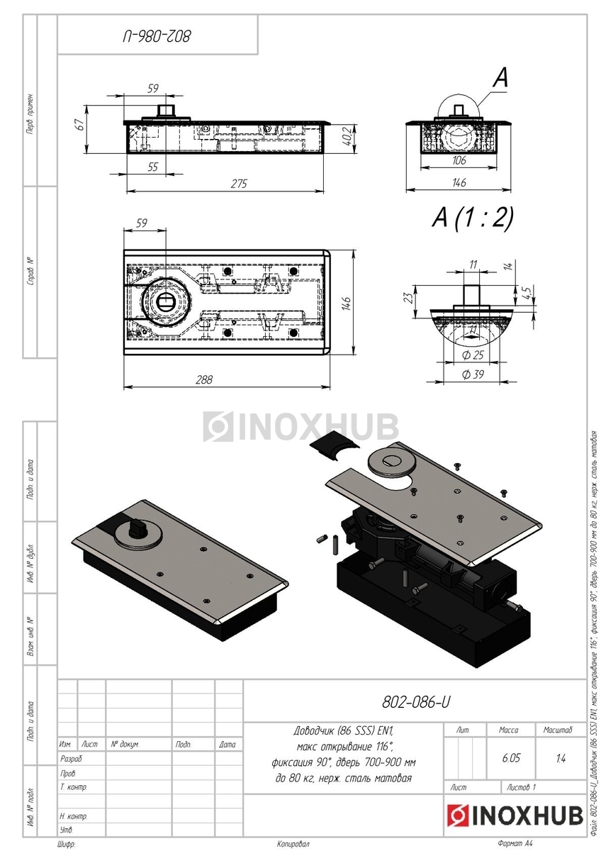 Доводчик (86 SSS) EN1, макс открывание 116°, фиксация 90°, дверь 700-900 мм до 80 кг, нерж. сталь матовая, в соответствии отраслевым стандартам из коррозионно-стойкого материала. Изделие применяется в составе металлических, стеклянных или комбинированных конструкций, где важны точные размеры, прочность соединений и стабильность в эксплуатации. Может использоваться при внутреннем и наружном монтаже — в зависимости от поставленной задачи и совместимых компонентов.
