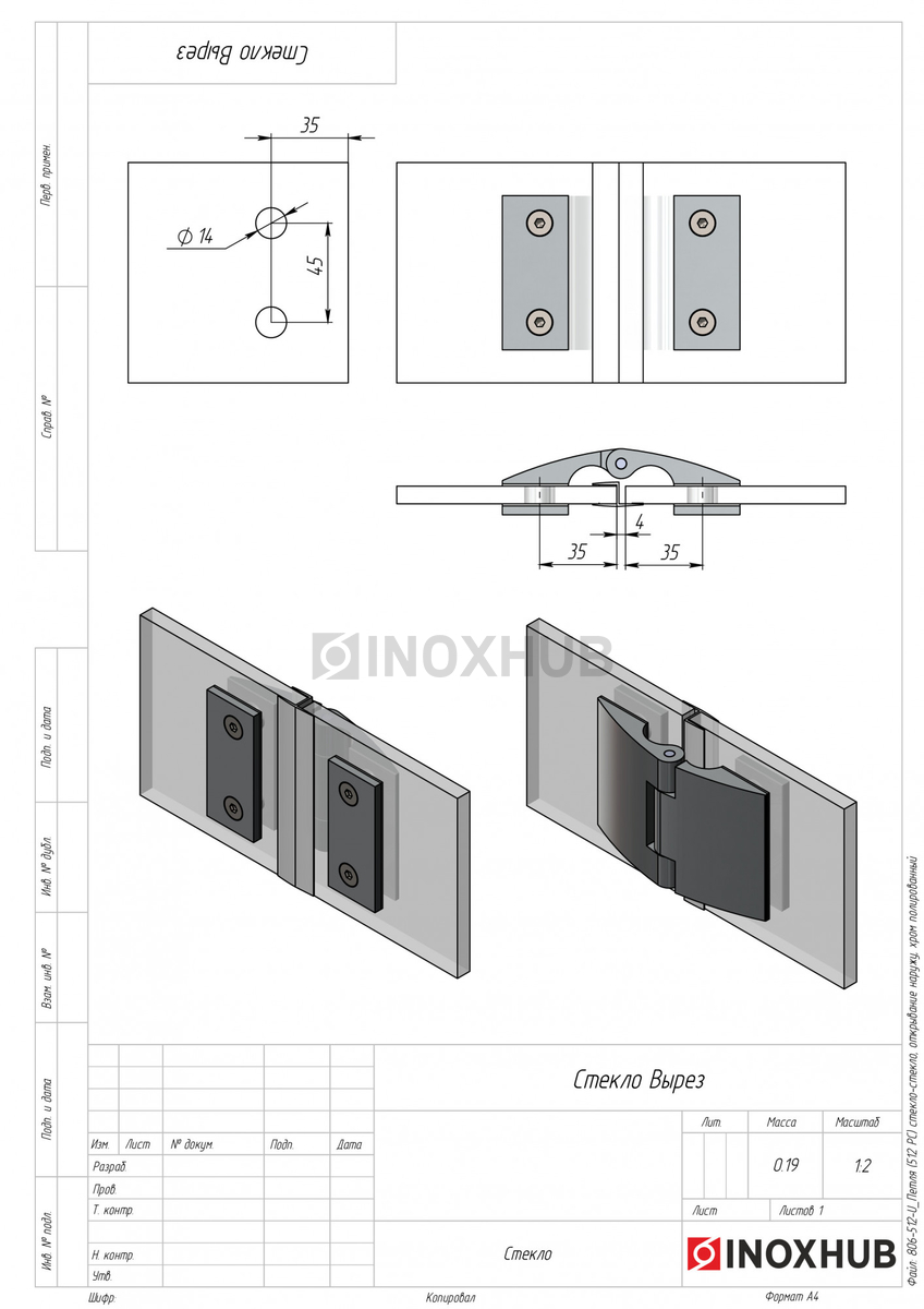 Сборка и монтаж. Подготовьте отверстия в стекле и двери согласно чертежу. Петля не требует реза уплотнителя, все крепежные элементы поставляются в комплекте. Модель устанавливается на шестигранные винты.