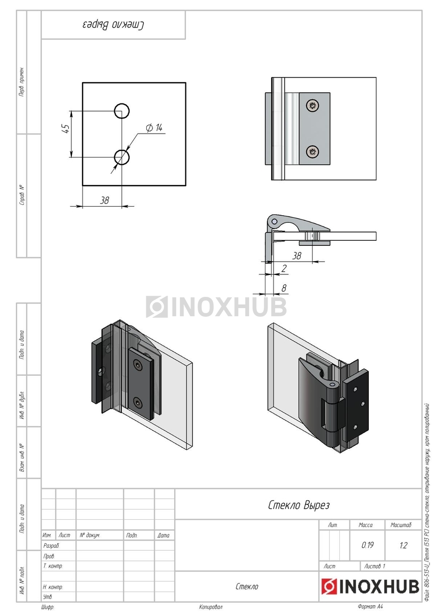 Сборка и монтаж. Подготовьте отверстия в стене и двери согласно чертежу. Петля не требует реза уплотнителя, все крепежные элементы поставляются в комплекте. Модель устанавливается на шестигранные винты.