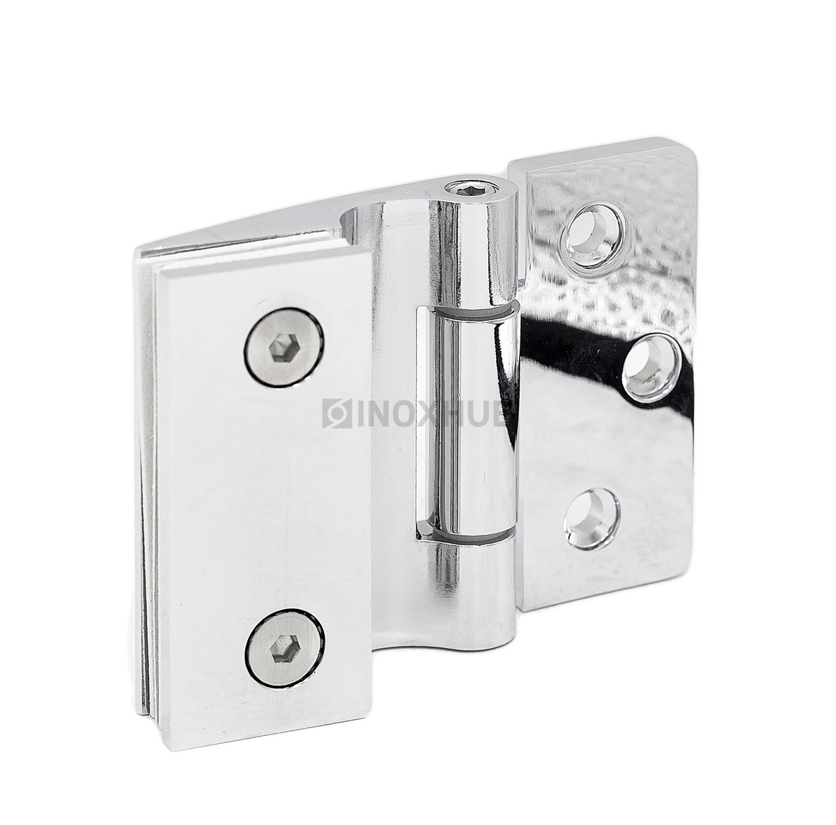Применение. Петля используется для крепления стеклянной двери душевой кабины или перегородки под углом 90°. Элемент обеспечивает открывание наружу без фиксации. Монтаж производится на стену. Модель подходит для стекол шириной 8-10 мм. Рекомендуемая ширина полотна — 600 мм при весе двери 30 кг на обе петли.
