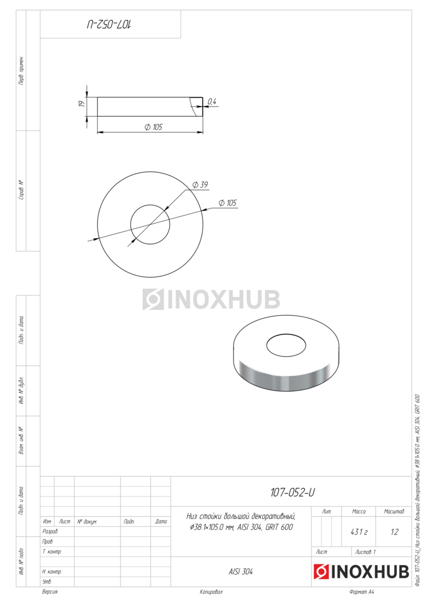 Низ стойки большой декоративный, Ø38.1×100.0 мм, AISI 304, GRIT 600 в продаже. Оперативная доставка со склада в Москве. Все товары соответствуют стандартам качества.