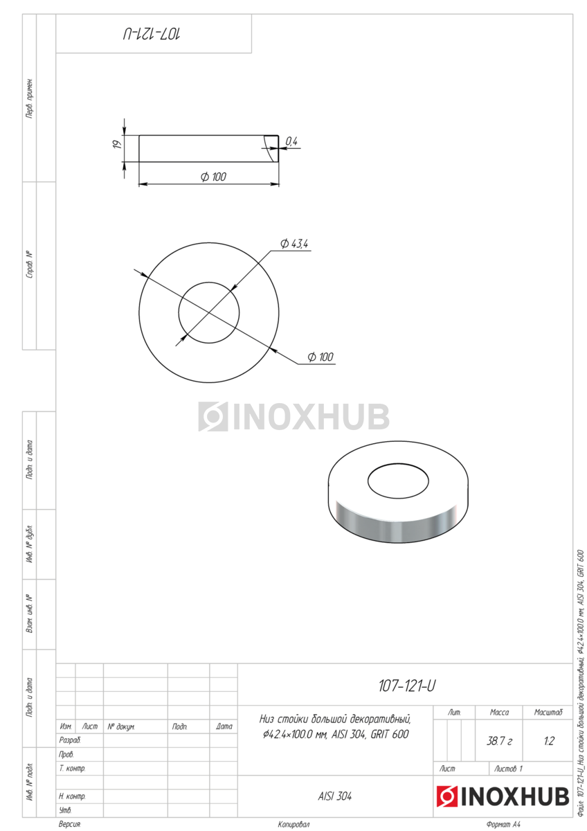 Низ стойки большой декоративный, Ø42.4×100.0 мм, AISI 304, GRIT 600 в продаже. Оперативная доставка со склада в Москве. Все товары соответствуют стандартам качества.