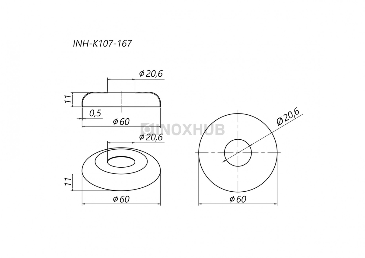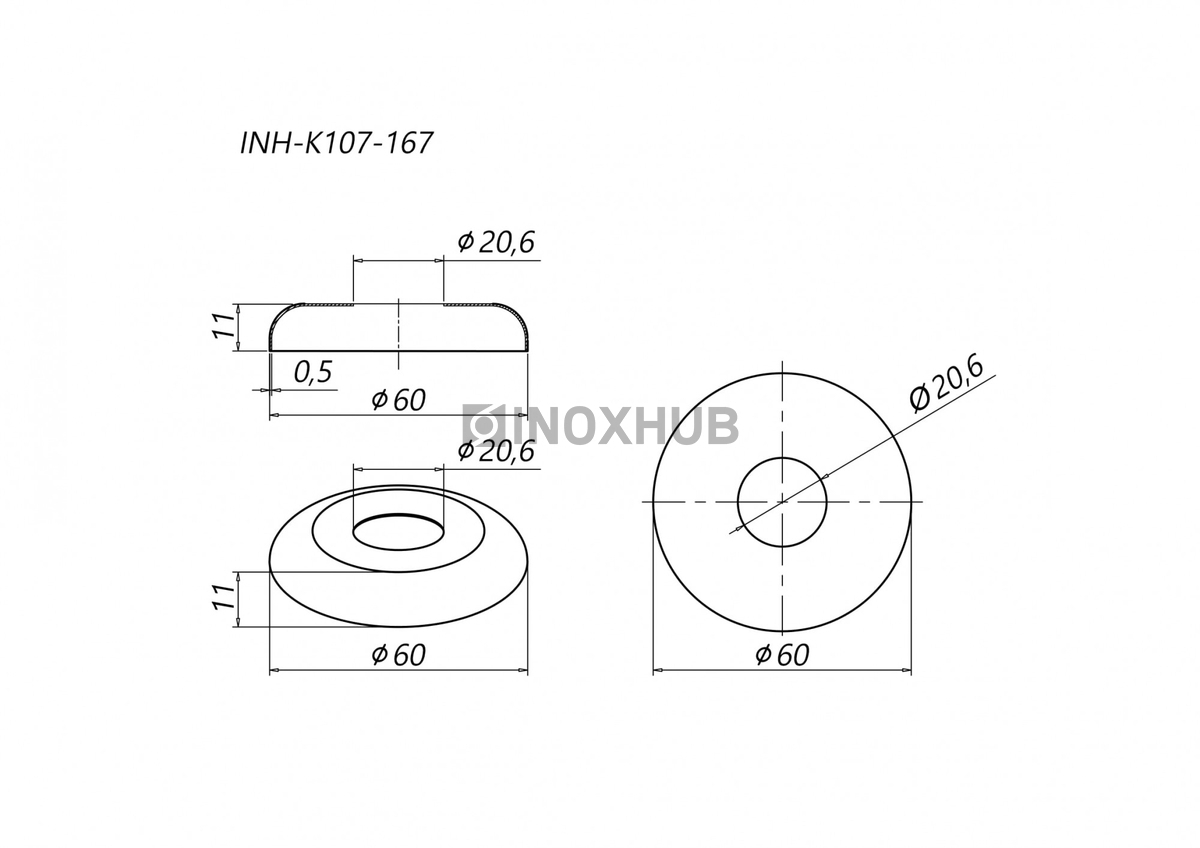 Низ стойки малый изготовлен из нержавеющей стали марки AISI 304. Элемент можно устанавливать в помещении и на улице. Деталь используется для стоек диаметром 20 мм. Внешний диаметр элемента — 60 мм. Поверхность полированная GRIT 600, устойчива к коррозии.