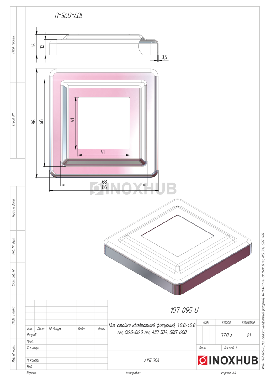 Низ стойки квадратный фигурный, 40.0×40.0 мм / 86.0×86.0 мм, AISI 304, GRIT 600 в продаже. Оперативная доставка со склада в Москве. Все товары соответствуют стандартам качества.