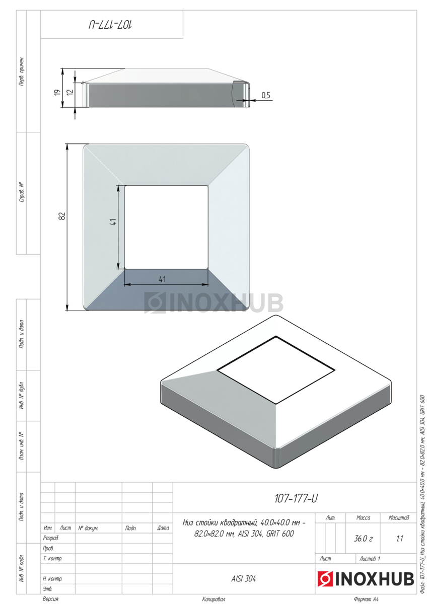 Низ стойки квадратный, 40.0×40.0 мм / 82.0×82.0 мм, AISI 304, GRIT 600 в продаже. Оперативная доставка со склада в Москве. Все товары соответствуют стандартам качества.