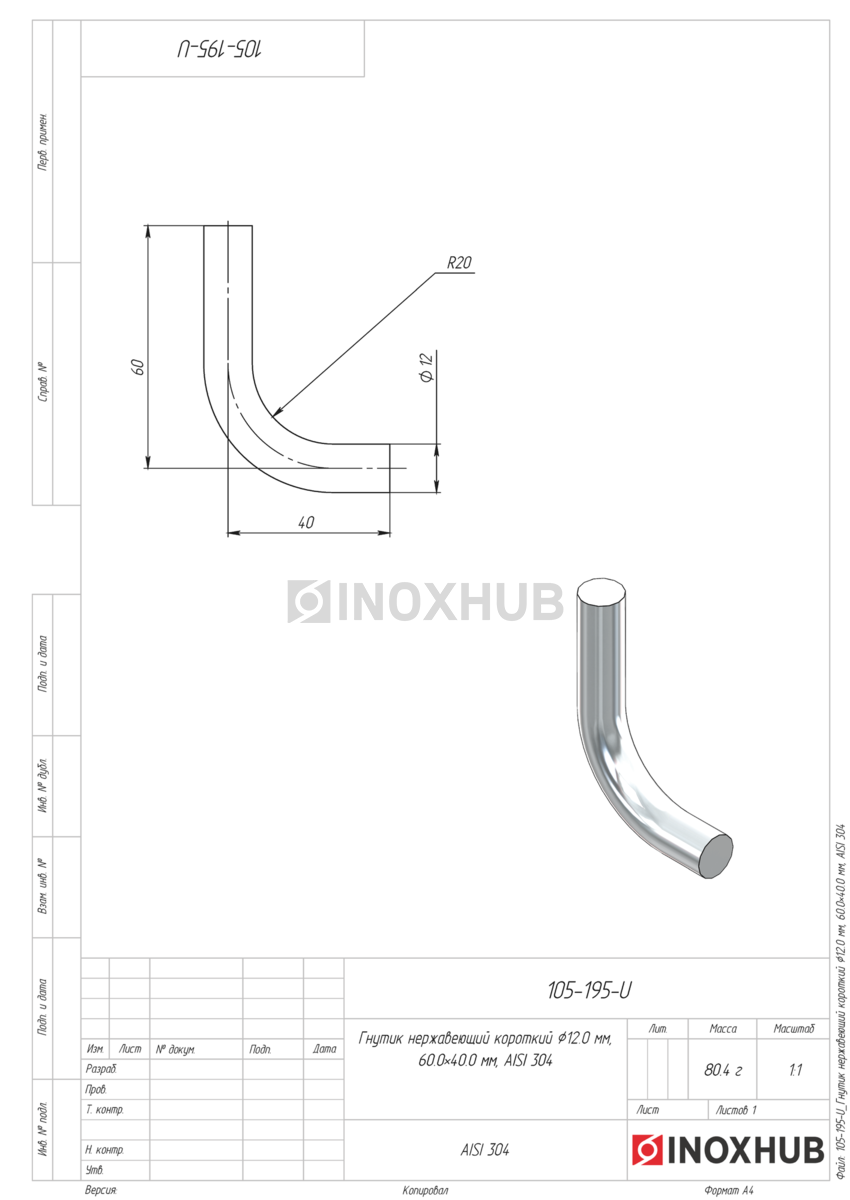 Гнутик нержавеющий короткий Ø12.0 мм, 60.0×40.0 мм, AISI 304 в продаже. Оперативная доставка со склада в Москве. Все товары соответствуют стандартам качества.