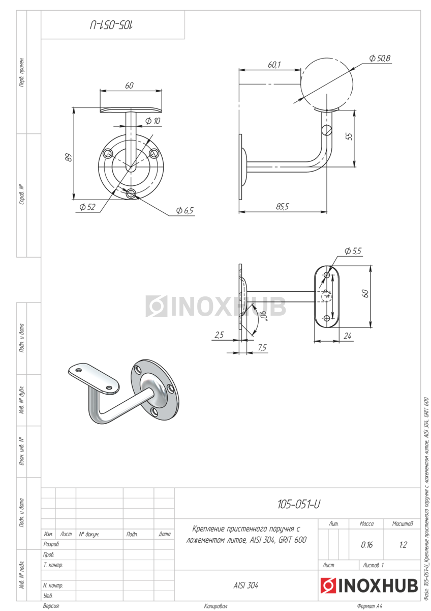 Крепление пристенного поручня с ложементом (Ø50.8), AISI 304, GRIT 600 в продаже. Оперативная доставка со склада в Москве. Все товары соответствуют стандартам качества.