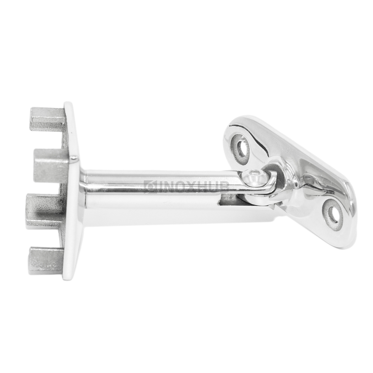 Сборка и монтаж. Крепится с помощью сварки, а также на клей или с помощью саморезов (специальные отверстия предусмотрены). Регулируемый ложемент позволяет использовать его на прямых участках, а также на лестничных маршах. Ложе предусматривает установку поручня диаметром 50,8 мм, а также установку трубы диаметром 38,1 или 42,4 мм.