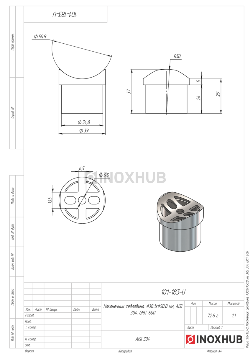 Наконечник седловина, Ø38.1ר50.8 мм, AISI 304, GRIT 600 в продаже. Оперативная доставка со склада в Москве. Все товары соответствуют стандартам качества.