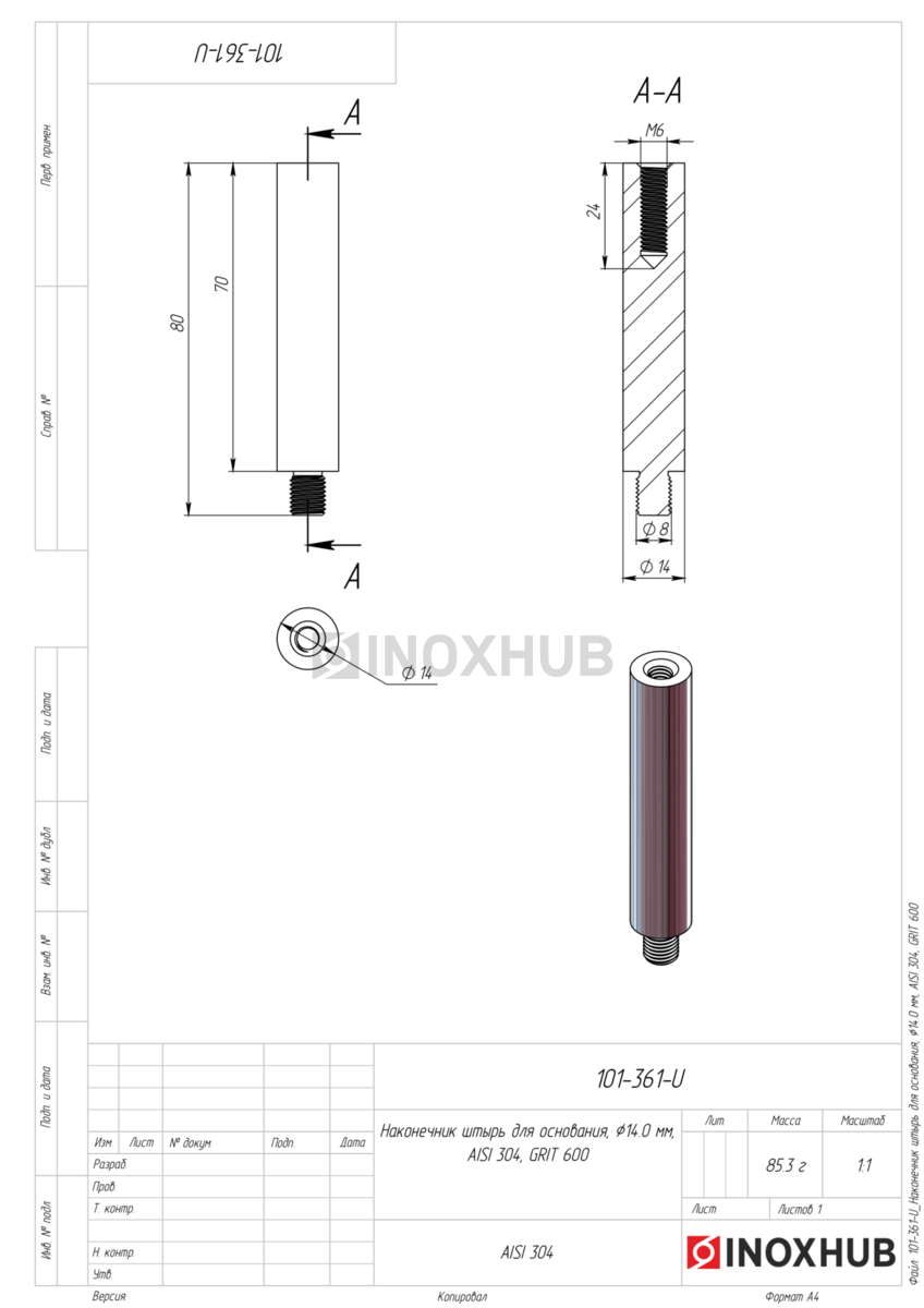 Наконечник штырь для основания, Ø14.0 мм, AISI 304, GRIT 600 в продаже. Оперативная доставка со склада в Москве. Все товары соответствуют стандартам качества.