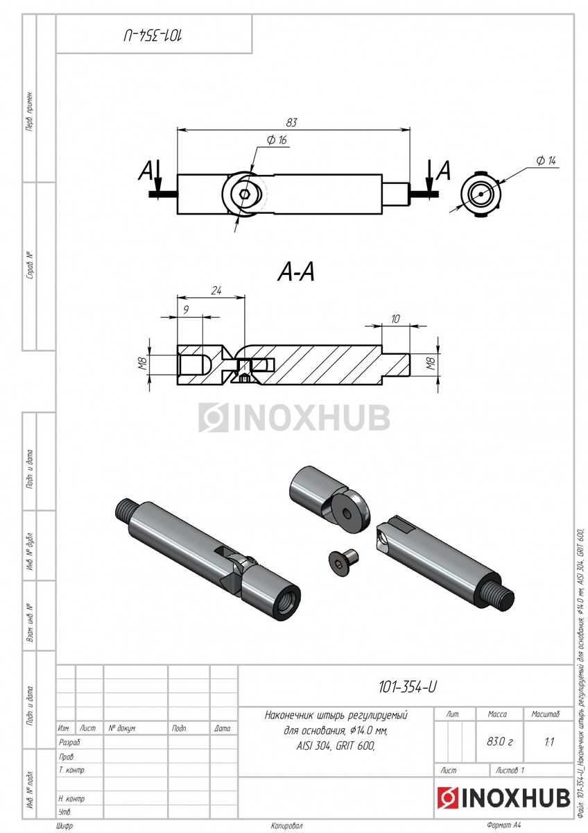 Наконечник штырь регулируемый. Предназначен для основания. Изготовлен из стали AISI 304. Полированная GRIT 600 поверхность. Подходит для лестничных маршей, а также горизонтальных поверхностей.