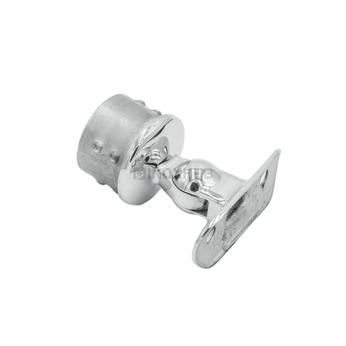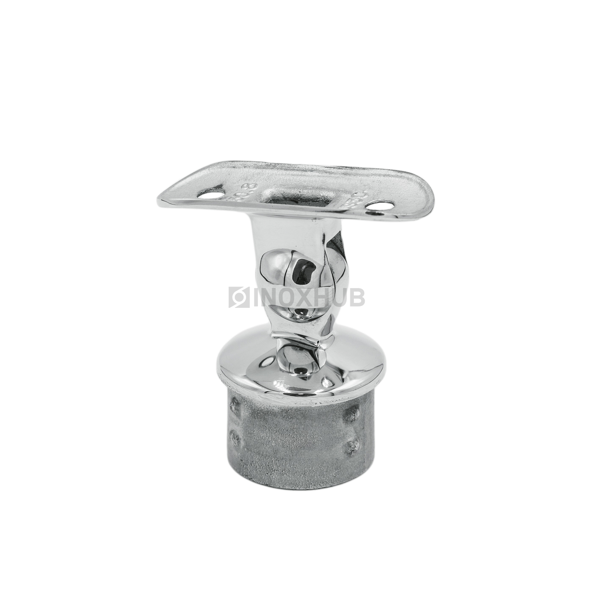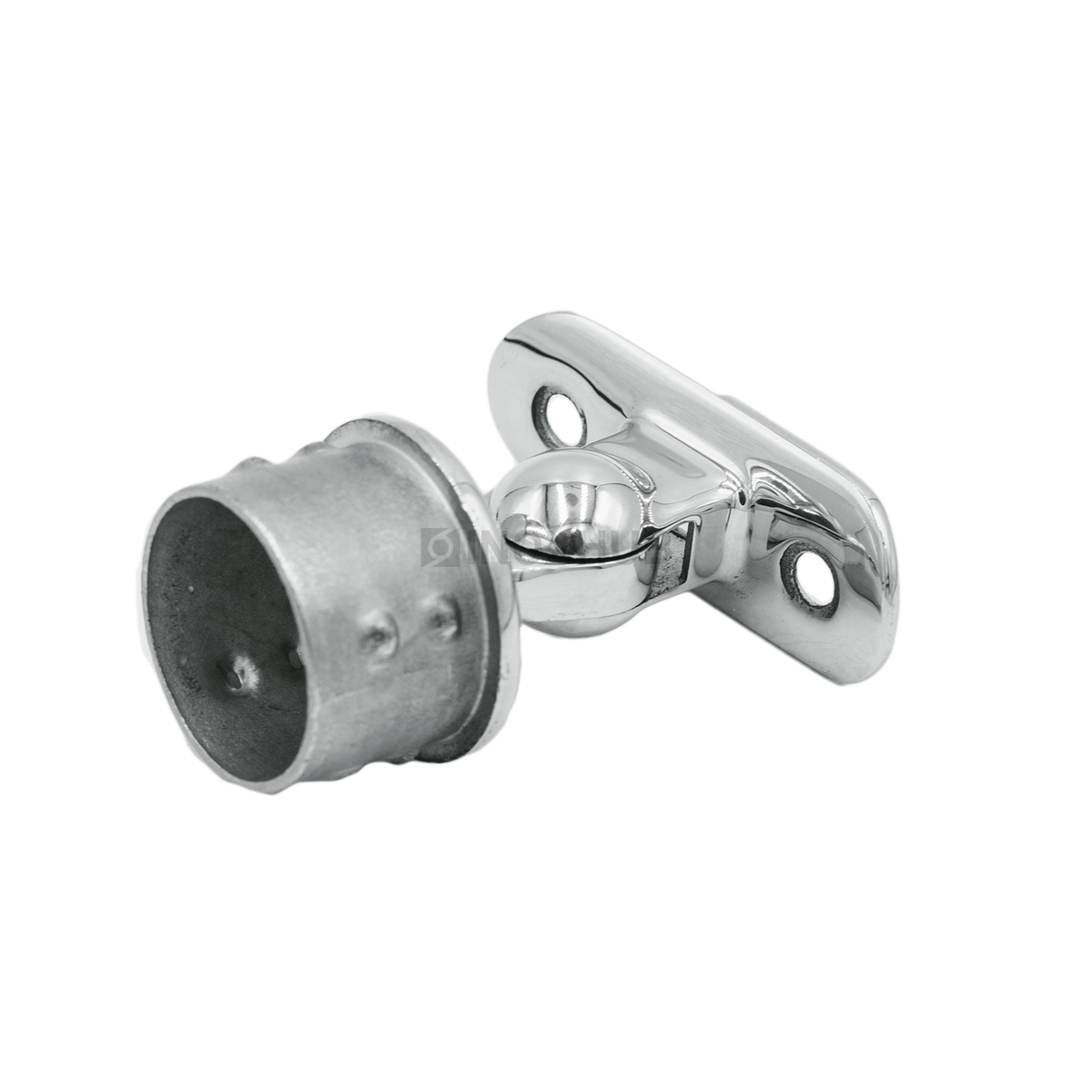 Наконечник шаровой с настраиваемым ложементом. За счет шарнира удается менять угол наклона ложа. Это делает изделие универсальным. Его можно использовать для установки на прямом участке ограждения, а также на лестницах. Материал — нержавеющая сталь AISI 304 — подходит для уличного применения.