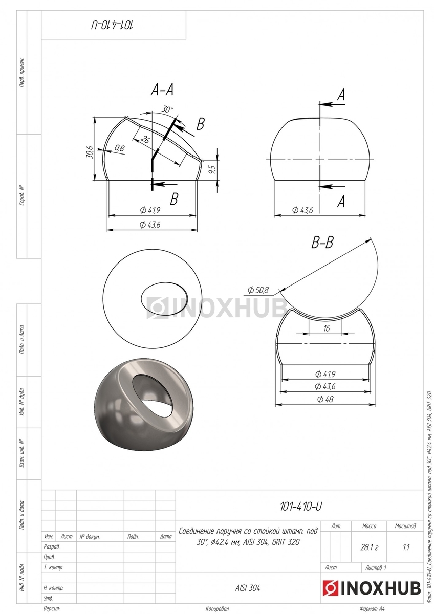Соединение поручня со стойкой под 30°, Ø42.4 мм, AISI 304, GRIT 320 в продаже. Оперативная доставка со склада в Москве. Все товары соответствуют стандартам качества.