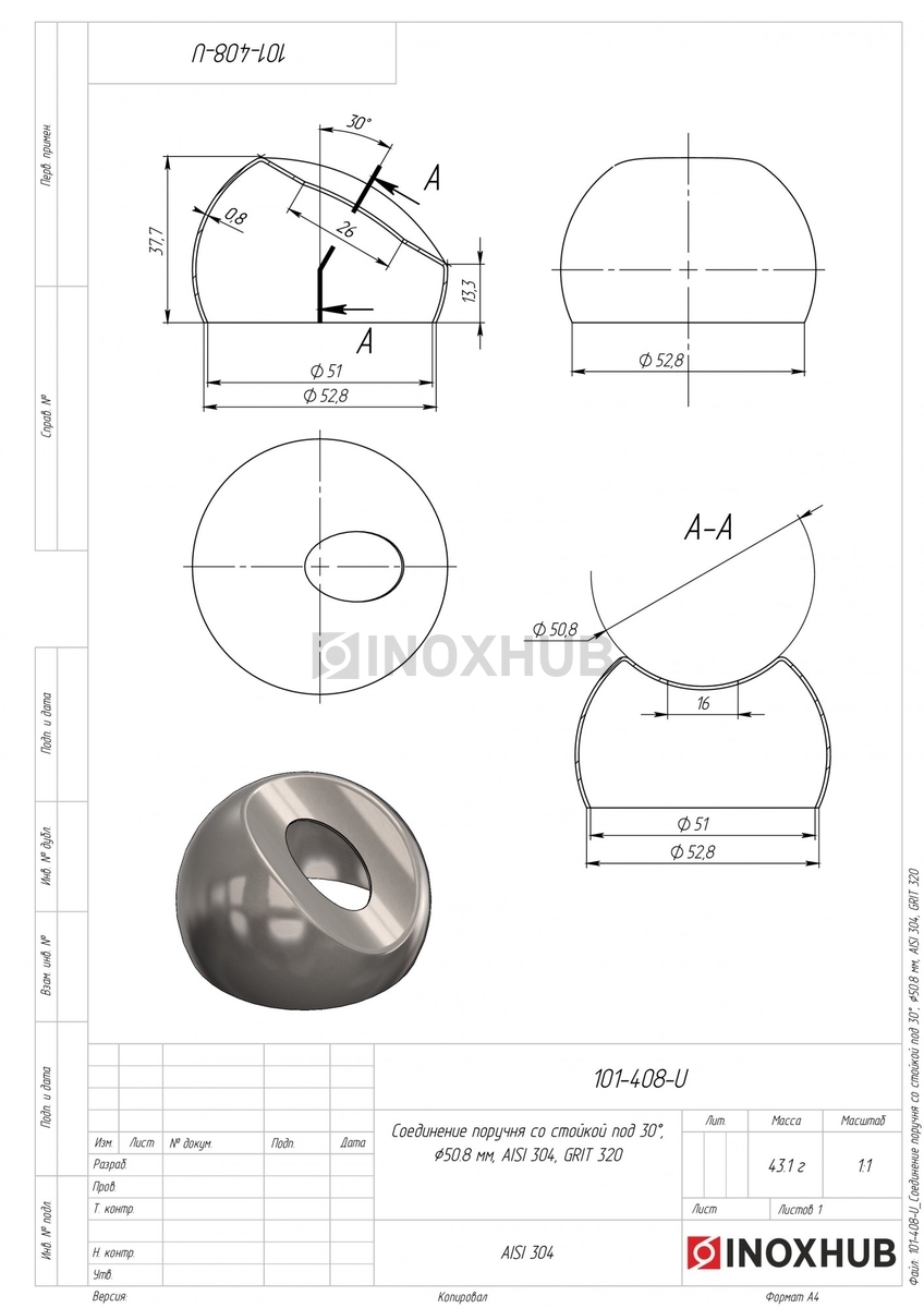 Соединение поручня со стойкой под 30°, Ø50.8 мм, AISI 304, GRIT 320 в продаже. Оперативная доставка со склада в Москве. Все товары соответствуют стандартам качества.