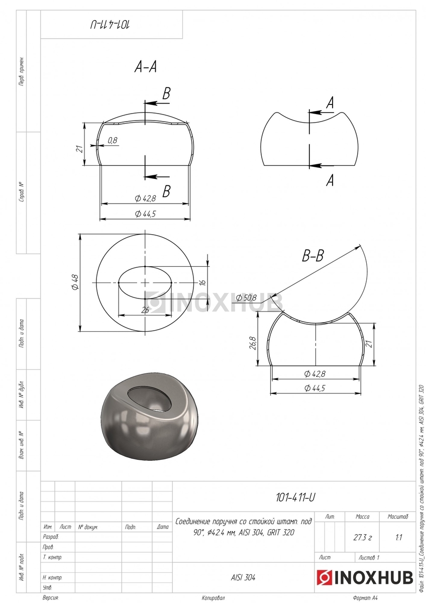 Соединение поручня со стойкой штамп. под 90°, Ø42.4 мм, AISI 304, GRIT 320 в продаже. Оперативная доставка со склада в Москве. Все товары соответствуют стандартам качества.