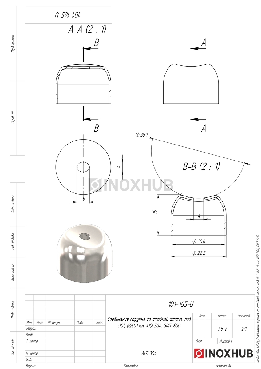 Соединение поручня со стойкой штамп. под 90°, Ø20.0 мм, AISI 304, GRIT 600 в продаже. Оперативная доставка со склада в Москве. Все товары соответствуют стандартам качества.