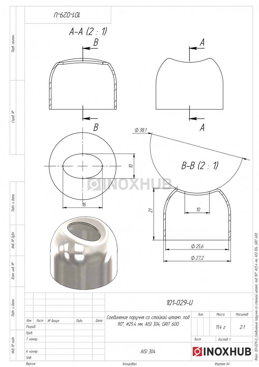 Соединение поручня со стойкой штамп. под 90°, Ø25.4 мм, AISI 304, GRIT 600 в продаже. Оперативная доставка со склада в Москве. Все товары соответствуют стандартам качества.