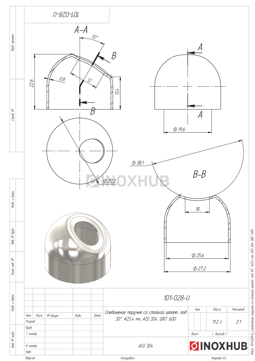 Соединение поручня со стойкой штамп. под 30°, Ø25.4 мм, AISI 304, GRIT 600 в продаже. Оперативная доставка со склада в Москве. Все товары соответствуют стандартам качества.