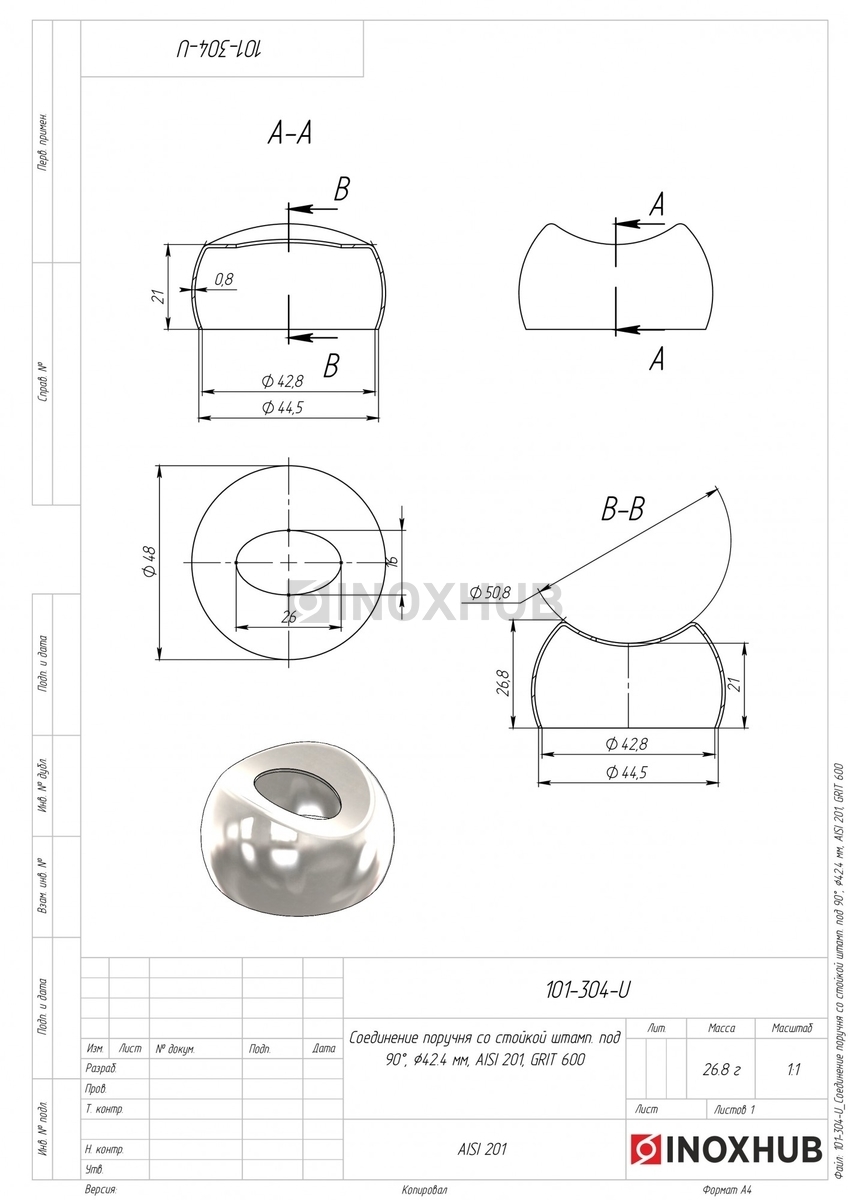 Соединение поручня со стойкой штамп. под 90°, Ø42.4 мм, AISI 201, GRIT 600 в продаже. Оперативная доставка со склада в Москве. Все товары соответствуют стандартам качества.