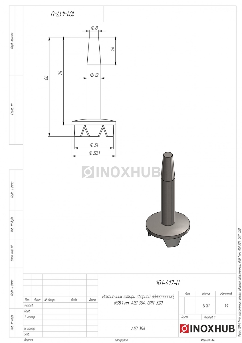 Наконечник штырь сварной облегченный, Ø38.1 мм, AISI 304, GRIT 320 в продаже. Оперативная доставка со склада в Москве. Все товары соответствуют стандартам качества.