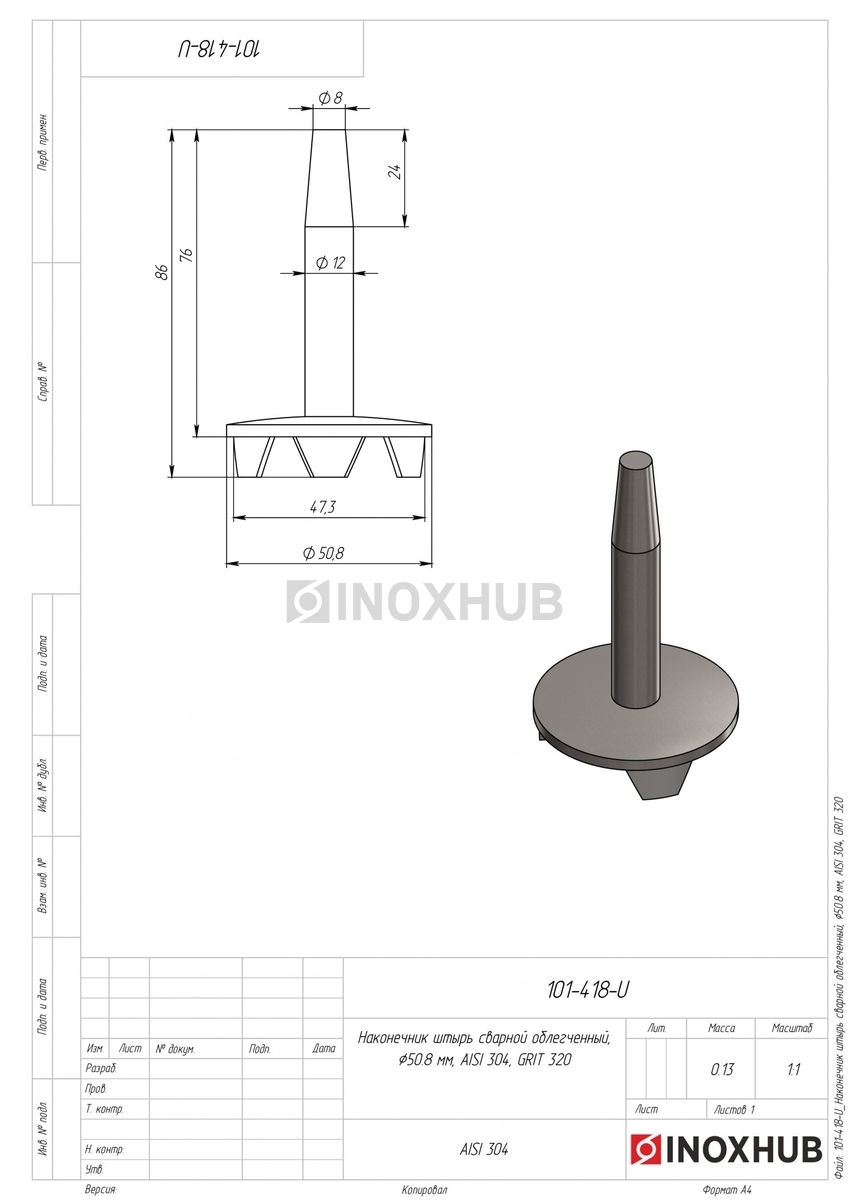 Наконечник штырь сварной облегченный, Ø50.8 мм, AISI 304, GRIT 320 в продаже. Оперативная доставка со склада в Москве. Все товары соответствуют стандартам качества.