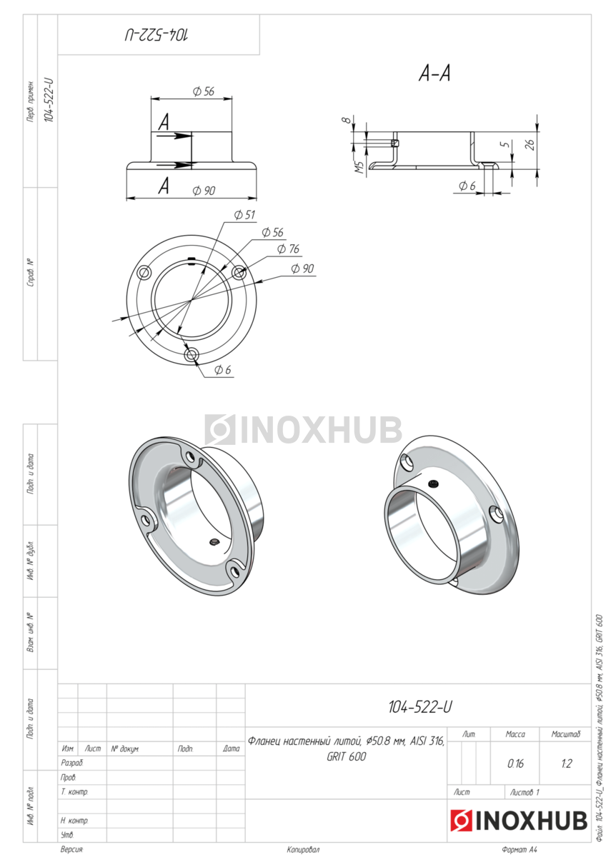 Фланец настенный литой, Ø50.8 мм, AISI 316, GRIT 600 в продаже. Оперативная доставка со склада в Москве. Все товары соответствуют стандартам качества.