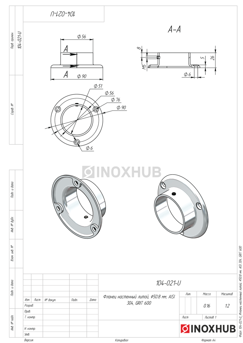 Фланец настенный литой, Ø50.8 мм, AISI 304, GRIT 600 в продаже. Оперативная доставка со склада в Москве. Все товары соответствуют стандартам качества.
