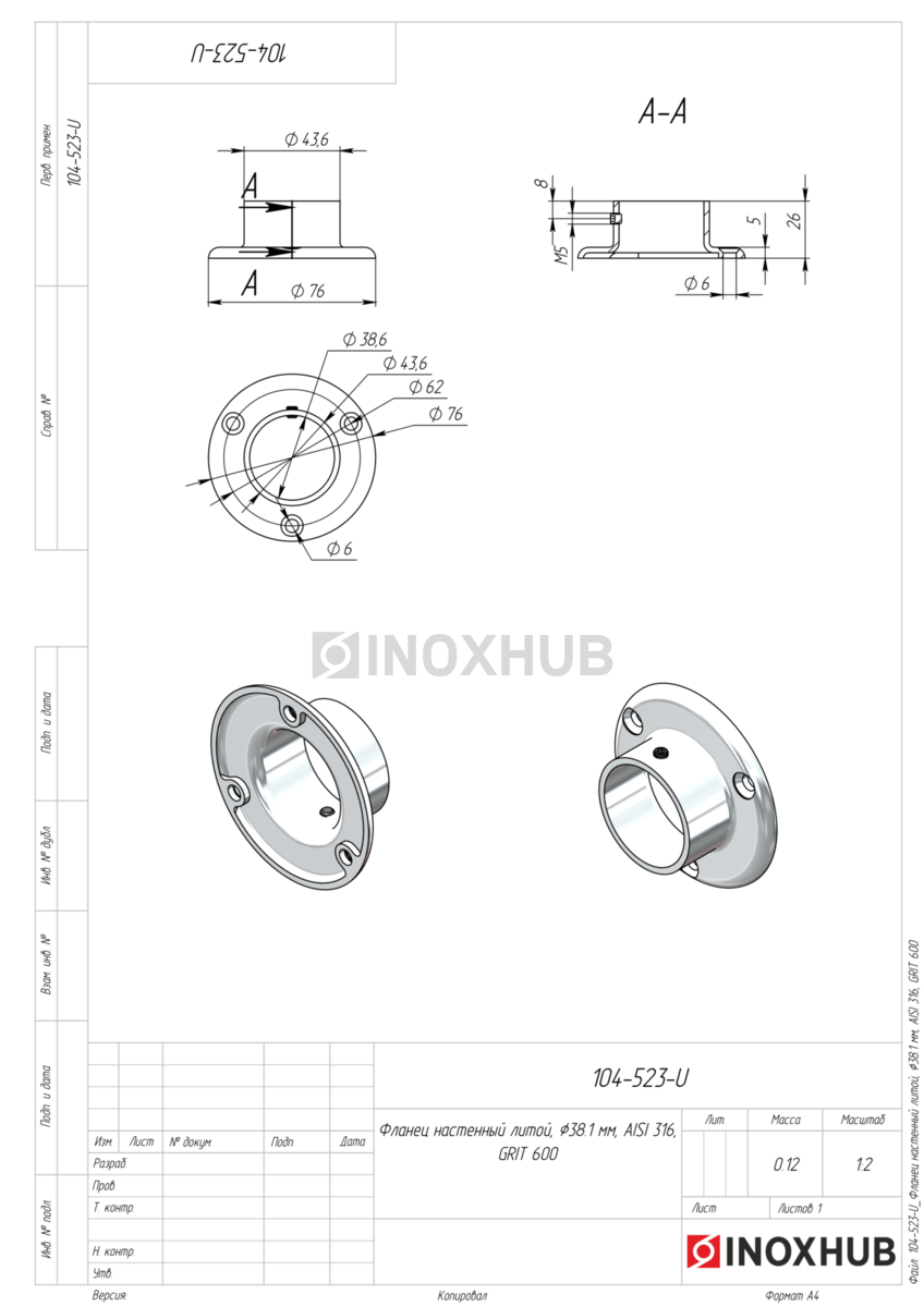 Фланец настенный литой, Ø38.1 мм, AISI 316, GRIT 600 в продаже. Оперативная доставка со склада в Москве. Все товары соответствуют стандартам качества.