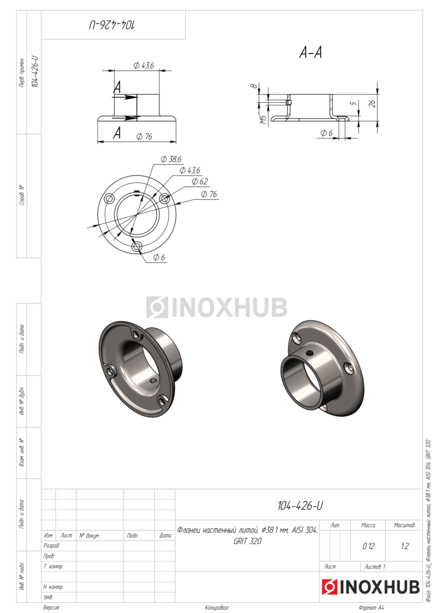 Фланец настенный литой, Ø38.1 мм, AISI 304, GRIT 320 в продаже. Оперативная доставка со склада в Москве. Все товары соответствуют стандартам качества.