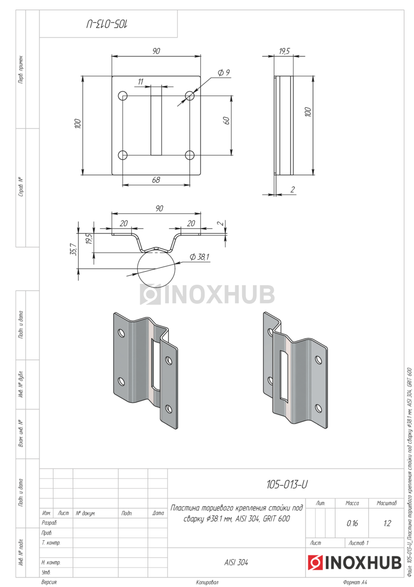 Пластина торцевого крепления стойки под сварку, Ø38.1 мм, AISI 304, GRIT 600 в продаже. Оперативная доставка со склада в Москве. Все товары соответствуют стандартам качества.